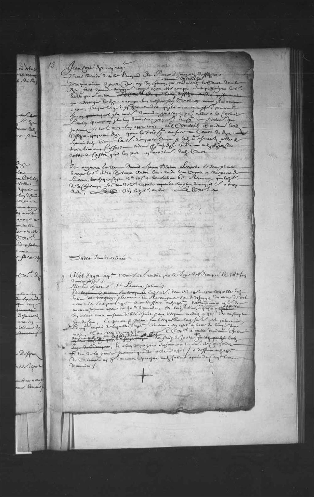 Transcription du texte avec orthographe modernisée : «Dudit jour de relevée. Abel SAGOT appelant d'une sentence rendue par le juge de Beaupré le 16e juin dernier passé. Nicolas HUOT dit Saint-Laurent intimé. Vu ladite sentence dont est appel par laquelle ledit intimé et le nommé la récompense sont déchargés du crime de vol à eux mis sus par l'appelant avec défenses audit appelant de les calomnier ni leur dire aucunes injures à peine de 30 livres d'amende, et ledit intimé condamné à payer à l'appelant un minot trois mesures de blé d'inde et aux dépens modérés a 30 sols et au surplus hors de Cour, le procès et pièces sur lesquelles ladite sentence est intervenue, la requête au pied de laquelle l'appelant est reçu à son appel en date du douzième de ce mois, tout vu et considéré, le Conseil a condamné l'intimé rendre audit appelant ledit blé d'inde a le décharger des frais de justice tant de la première instance que de celle d'appel, et à lui payer pour ses journées la somme de cent sols défenses audit appelant de calomnier ni faire aucuns reproches audit intimé à peine de cinquante livres d'amende.»