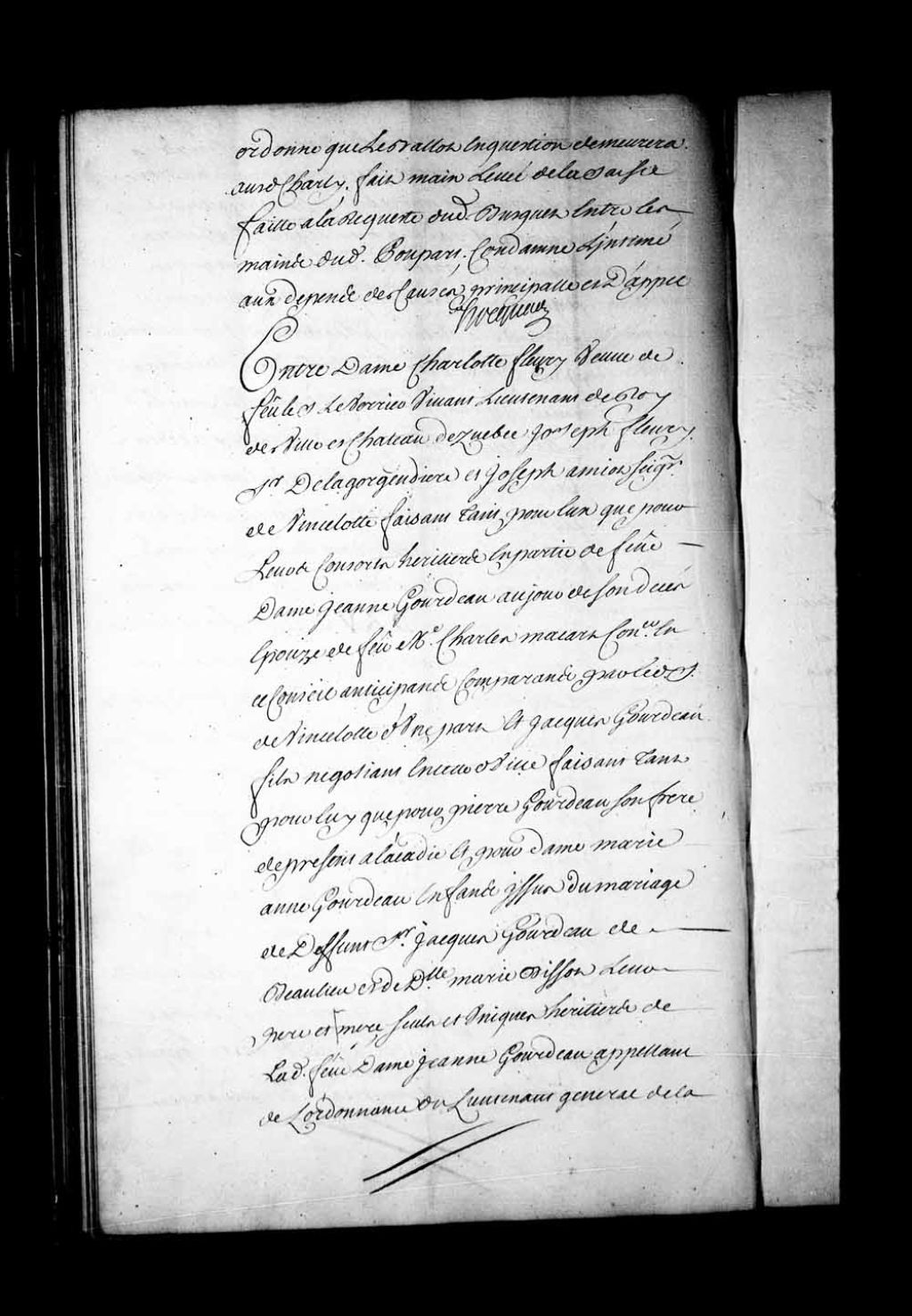 Appel mis à néant de l'ordonnance rendue par le lieutenant général de la Prévôté de Québec, le 6 mars 1733, dans la cause entre dame Charlotte Fleury, veuve du sieur Le Verrier, lieutenant du Roi de Québec, Joseph Fleury de la Gorgendière, et Joseph Amyot de Vincelotte, faisant, tant pour eux que pour leurs consorts, héritiers en partie de feu dame Jeanne Gourdeau, épouse de feu Charles Macart, conseiller, contre Jacques Gourdeau, fils, négociant de Québec, faisant tant pour lui que pour Pierre Gourdeau, son frère, présentement en Acadie, et pour dame Marie-Anne Gourdeau, enfants issus du mariage de défunt Jacques Gourdeau de Beaulieu et de Marie Bissot, leur père et mère, seuls et uniques héritiers de la dite feue dame Jeanne Gourdeau. Jacques Gourdeau est condamné à 3 livres d'amende de trois livres pour son «fol appel»