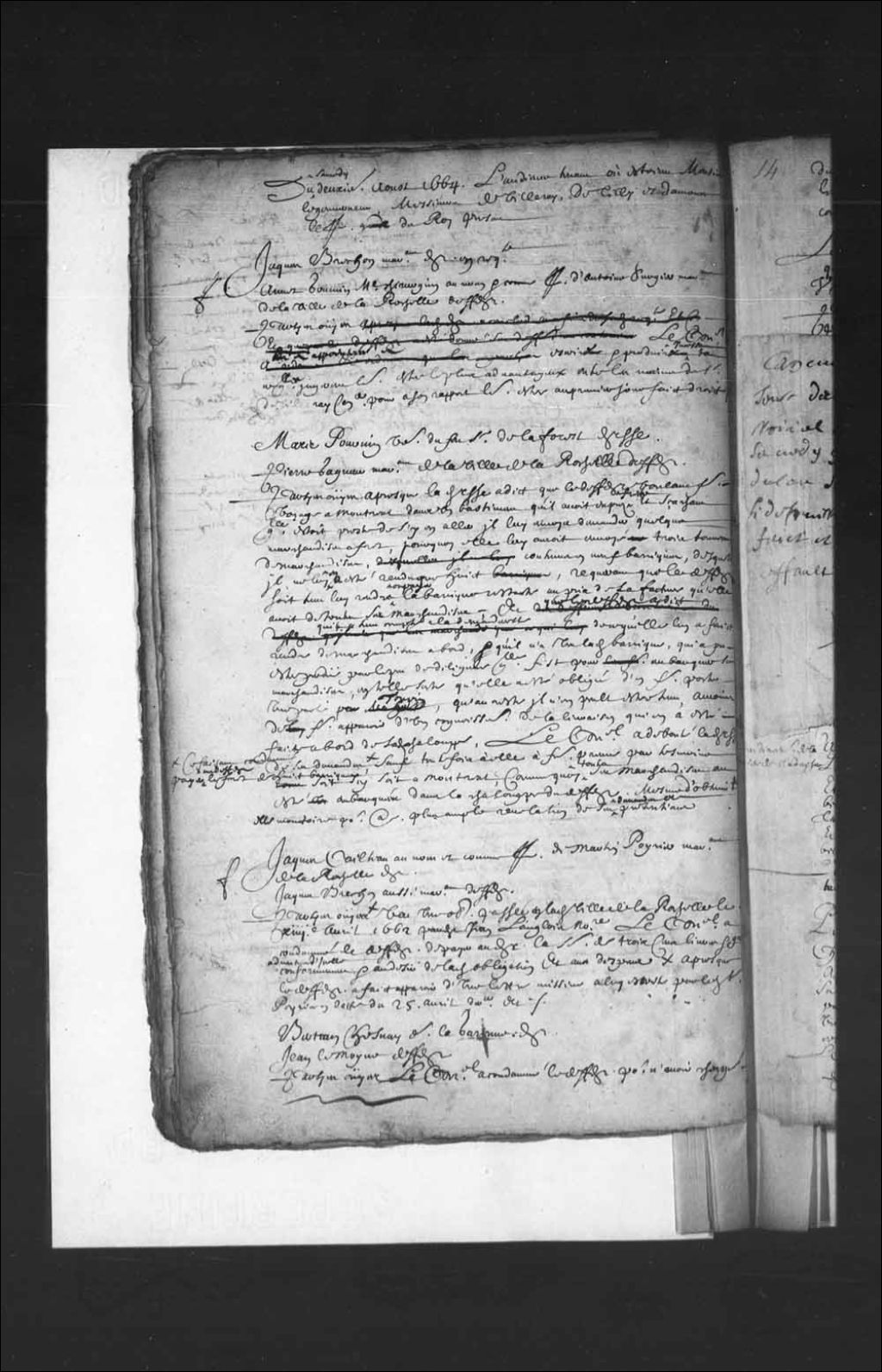 - Transcription du texte avec orthographe modernisée : «L'an mille six cent soixante-quatre le 3e jour d'août à la requête de Abraham Martin j'ai huissier royal donné assignation au nommés Julien à comparaître samedi prochain dix heure du matin par-devant nos seigneurs du Conseil pour se soir condamner à lui rendre une scie de travers qu'il lui a prêtée à son besoin et nécessité, fait et signifié le jour et an que dessus. LEVASSEUR. Défaut du 9 août 1664.»