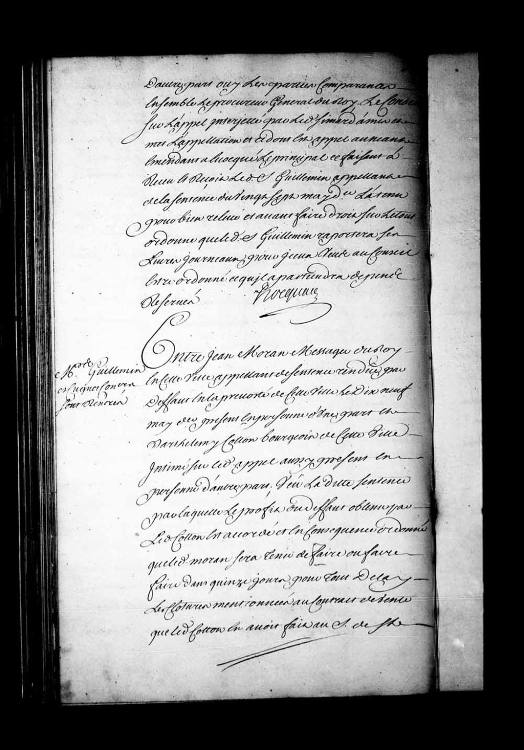 Appel mis à néant de la sentence rendue en la Prévôté de Québec, le 19 mai 1733, dans la cause entre Jean Moran, messager du Roi à Québec, et Barthélemy Cotton, bourgeois de Québec. Le Conseil sursis à l'exécution du présent arrêt pendant un mois, passé ce délai, il sera exécuté purement et simplement