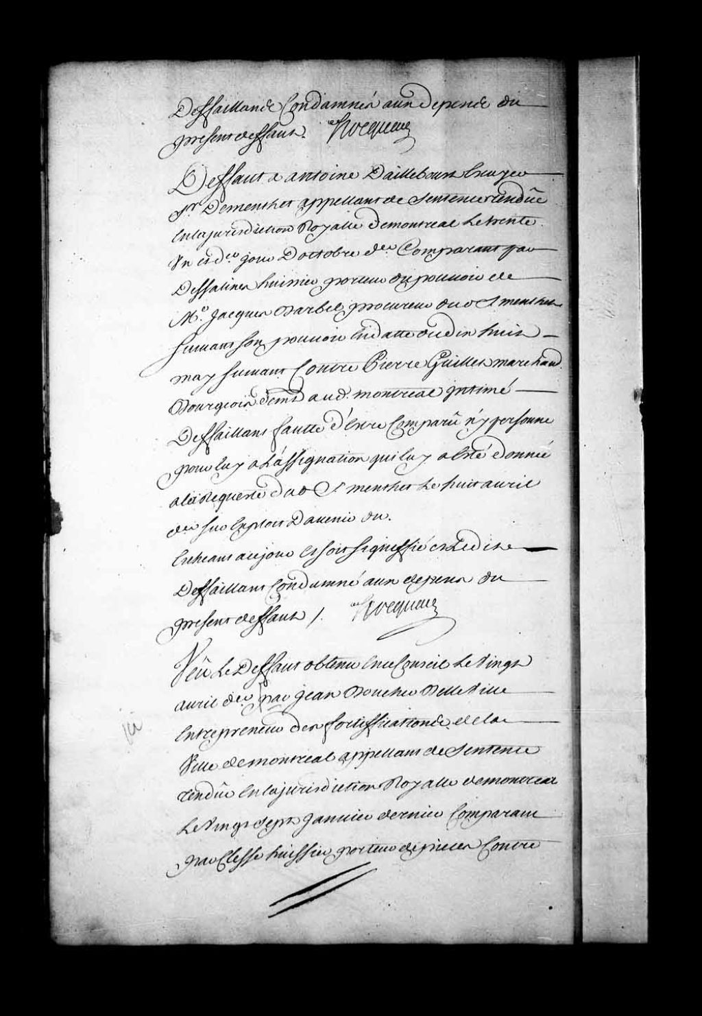 Arrêt qui ordonne, avant d'adjuger le profit du défaut obtenu en ce Conseil, le 20 avril 1733, par Jean Boucher Belleville, entrepreneur des fortifications de Montréal, contre Antoine Forestier et Élisabeth Camois, son épouse, que les pièces des parties seront remises à Jean Crespin (Crépin), conseiller, pour en être délibéré, 6 juillet 1733, Archives nationales à Québec, Fonds Conseil souverain, (03Q,TP1,S28,P17816).