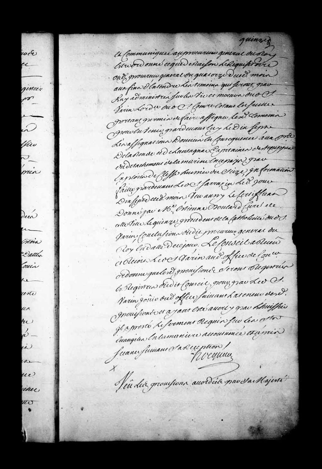 Arrêt qui reçoit François Foucault en la charge de conseiller au Conseil Supérieur à la place du feu sieur de Saint-Simon, et ordonne que ses provisions signées à Marly, le 18 avril 1733, seront enregistrées dans les registres du Conseil, 18 juillet 1733, Archives nationales à Québec, Fonds Conseil souverain, (03Q,TP1,S28,P17829).