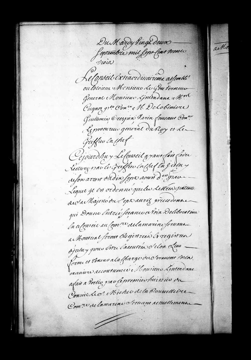 Installation du sieur Michel de la Rouvillière, commissaire de la Marine servant actuellement à Montréal, comme membre du Conseil Supérieur, en vertu des lettres patentes de Sa Majesté accordées à lui, le 7 avril 1733, 22 septembre 1733, Archives nationales à Québec, Fonds Conseil souverain, (03Q,TP1,S28,P17868).