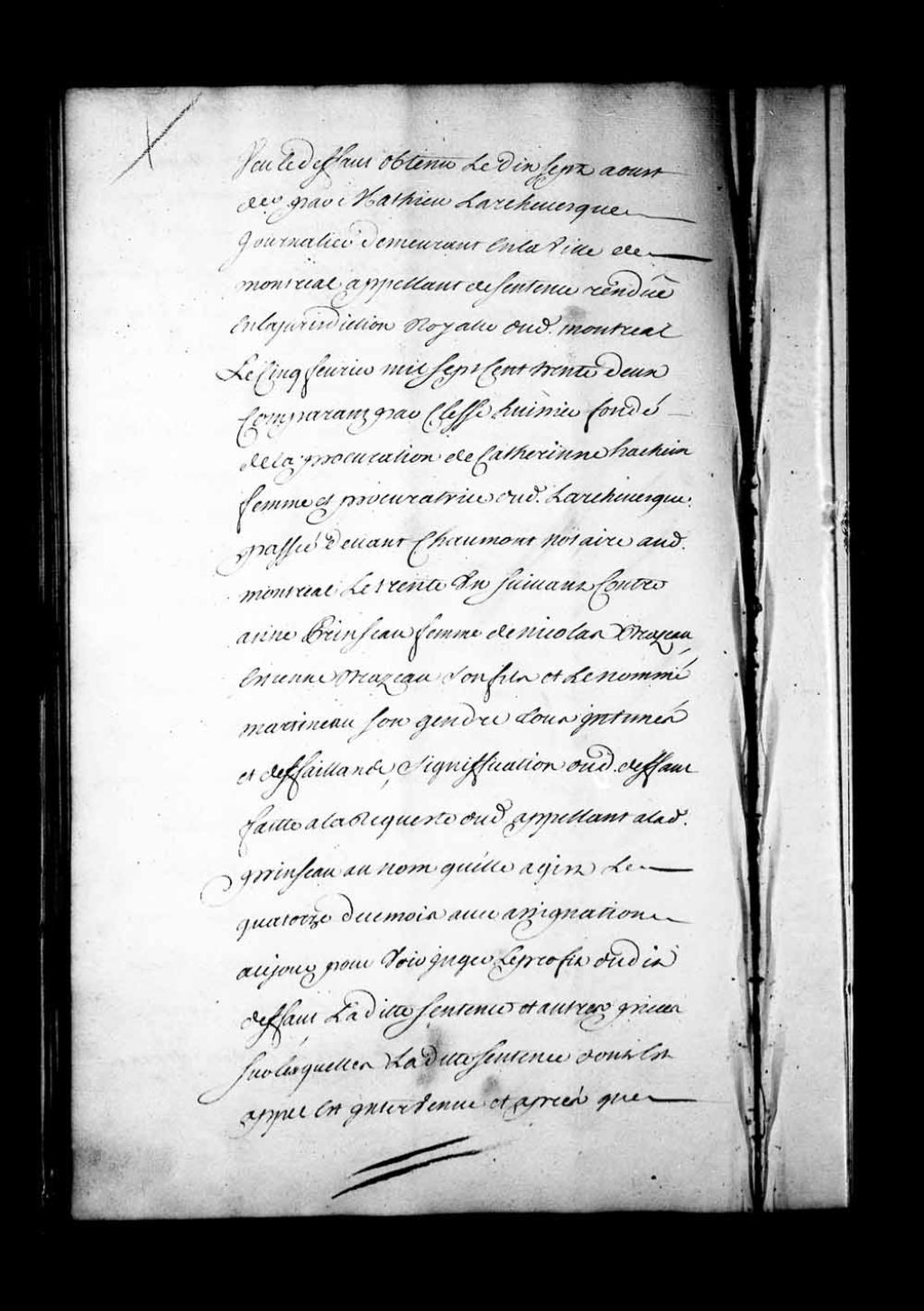 Arrêt qui, avant d'adjuger le profit du défaut obtenu, le 17 août 1733, par Mathieu Larchevêque, journalier de Montréal et appelant de la sentence rendue en la Juridiction de Montréal, le 5 février 1732, contre Anne Prinseau, femme de Nicolas Brazeau, Étienne Brazeau son fils, et le nommé Martineau, son gendre, ordonne que les pièces du dit Larchevêque seront remises à François-Étienne Cugnet., conseiller, pour en être délibéré