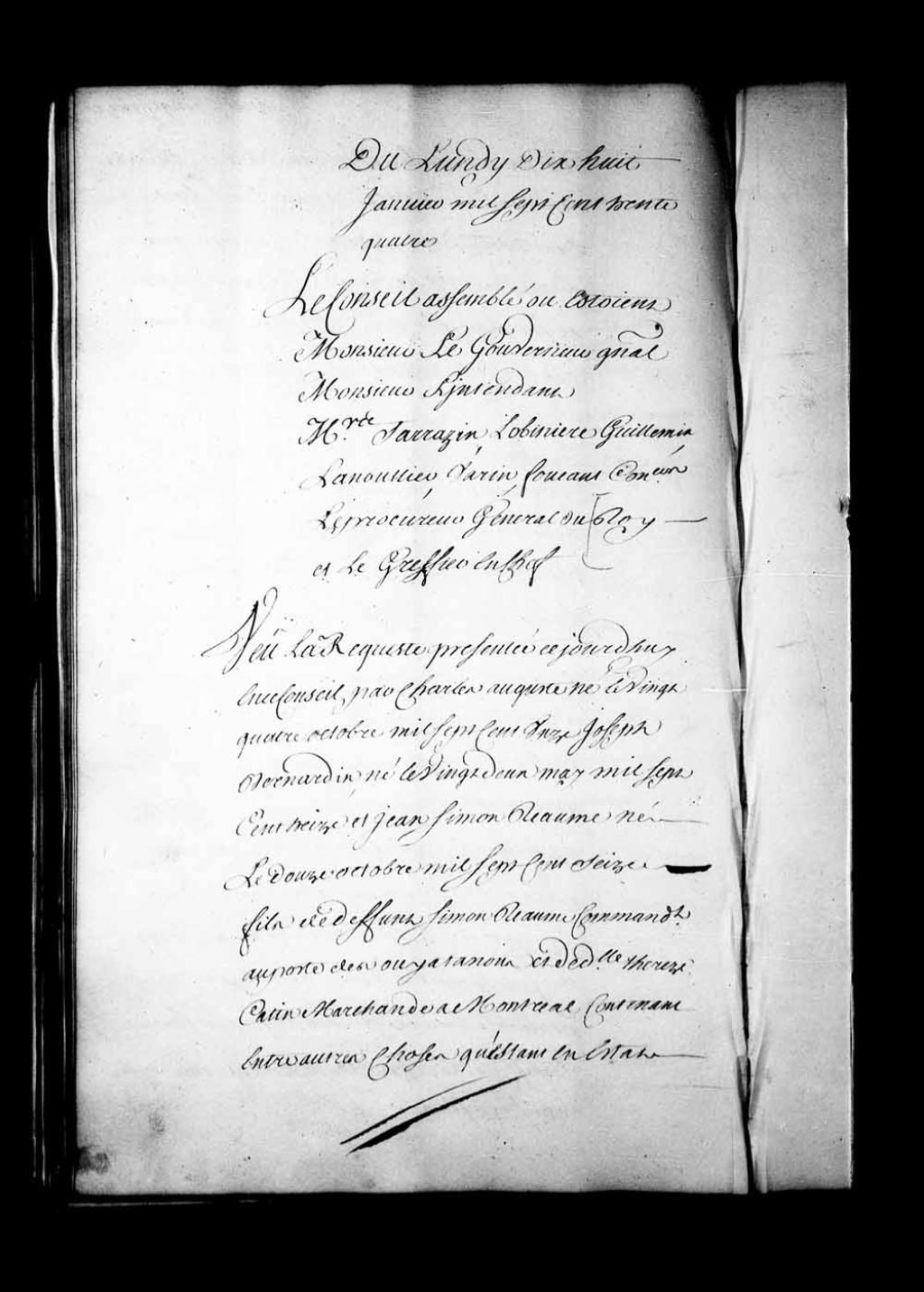 Arrêt qui ordonne d'expédier des lettres d'émancipation et bénéfice d'âge à Charles-Auguste, né le 24 octobre 1711, Joseph-Bernardin, né le 22 mai 1713, et Jean-Simon Rhéaume, né le 12 octobre 1716, fils de feu Simon Rhéaume, commandant au poste des Ouyatanons, et de Thérèse Catin, marchande à Montréal