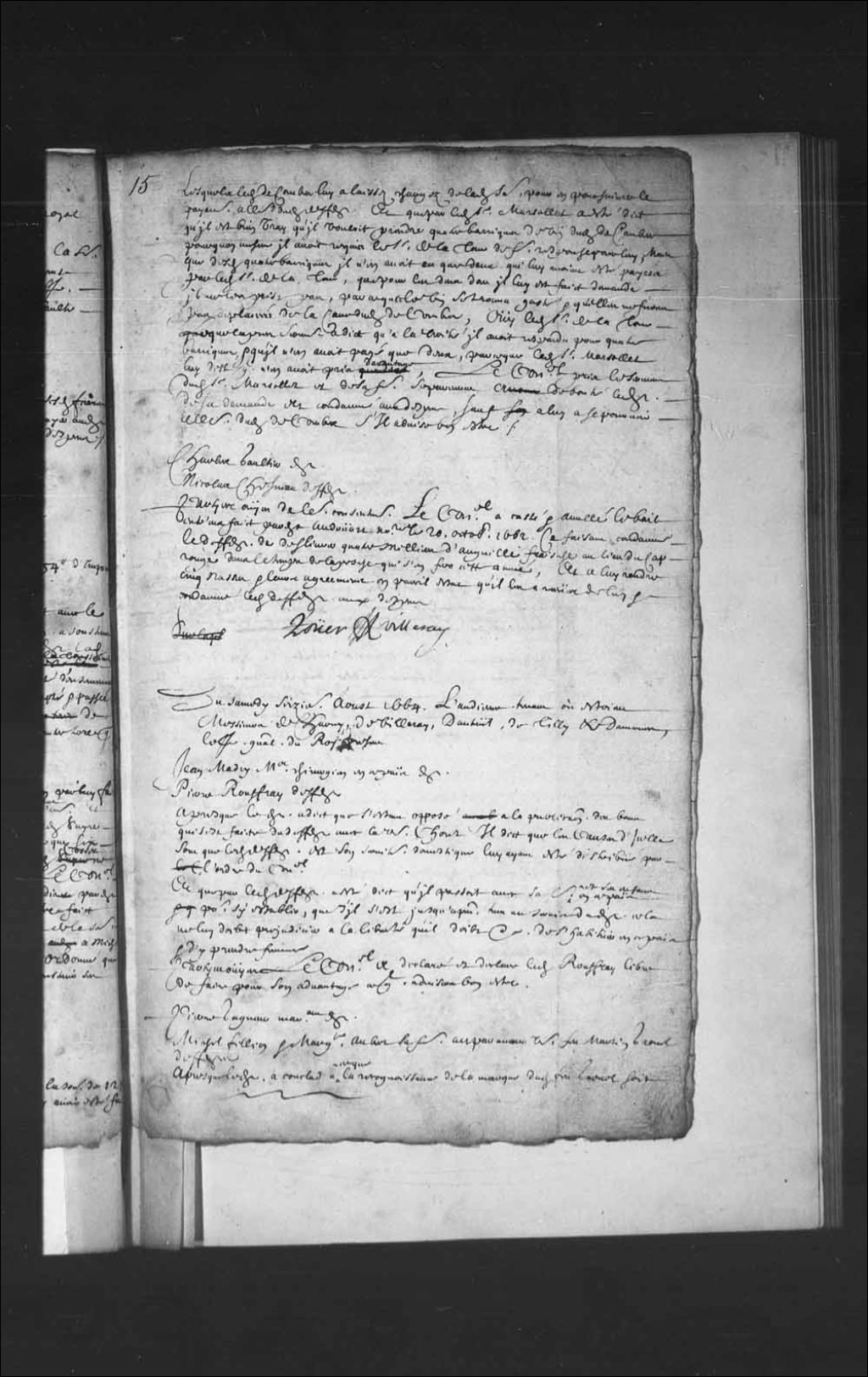 Transcription du texte avec orthographe modernisée : «Pierre GAGNEUR marchand demandeur. Michel FILLION et Marguerite Aubert sa femme auparavant veuve feu Martin Grouel défendeurs. Après que le demandeur a conclu à ce que la reconnaissance de la marque dudit feu Grouel soit faite étant apposée au bas de sa reconnaissance du 11e août 1660. ce fait à ce qu'ils soient condamnés lui payer la somme de 90 livres restante de plus grande somme. Et que par les défendeurs a été dit qu'ils ne reconnaissent point ladite marque et que si le demandeur avait raison au fond il devait faire signer des témoins de ses prétentions, d'autant que ladite marque ne peut faire de foi et qu'il serait facile à un chacun d'en faire faire une pour avoir de l'argent. Le Conseil a ordonné que le demandeur justifiera plus amplement de sa demande par témoins à faute de quoi renvoyé d'icelle avec dépens.»