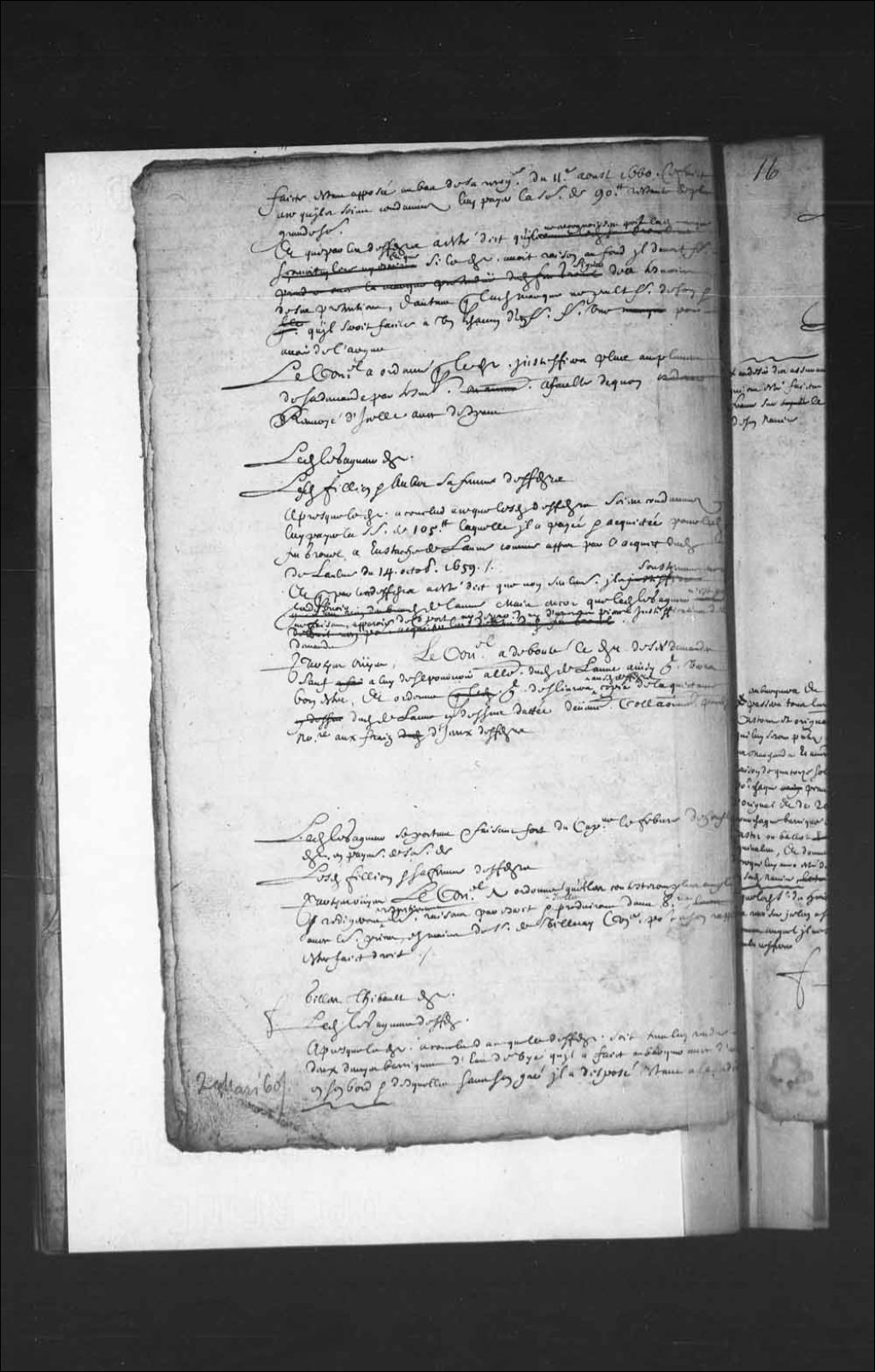 - Transcription du texte avec orthographe modernisée : «Ledit LE GAGNEUR demandeur. Lesdits FILLION et Aubert sa femme défendeurs. Après que le demandeur a conclu à ce que lesdits défendeurs soient condamnés lui payer la somme de 105 livres laquelle il a payée et acquittée pour ledit feu Grouel à Eustache de Laune comme appert par l'acquit dudit de Laulne du 14 octobre 1659. Et que par les défendeurs a été dit que non seulement ils soutiennent ne rien devoir audit de Laune mais encore que ledit le Gagneur n'est recevable ne faisant apparaître de transport ni de procuration ni d'aucunes pièces justificatives de ses demandes. Parties ouïes, le Conseil a débouté le demandeur de ses demandes sauf à lui de se pourvoir à l'encontre dudit de Laune ainsi qu'il verra bon être, et ordonne qu'il délivrera auxdits défendeurs copie de la quittance dudit de Laune ci-dessus datée dûment collationnée par-devant notaire aux frais d'iceux défendeurs.»