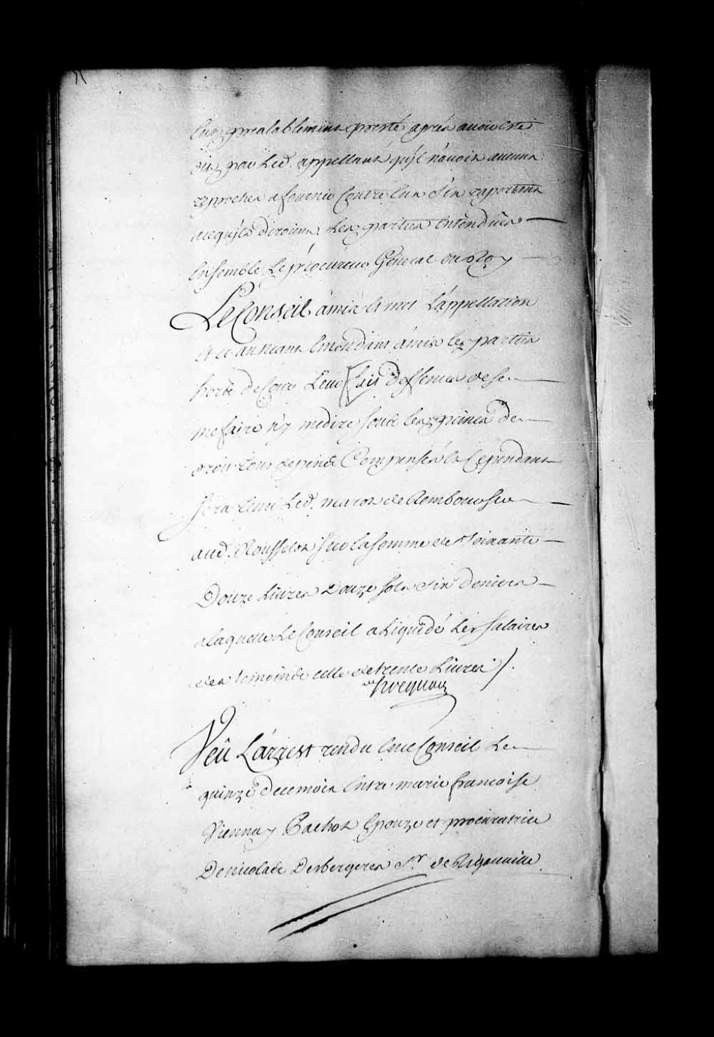 Arrêt qui ordonne que les pièces des parties seront remises à Nicolas Lanouillier, conseiller, dans la cause entre Marie-Françoise Vienney Pachot, épouse et procuratrice de Nicolas des Bergères de Rigauville, et Jean-Baptiste Couillard de Lespinay, 22 mars 1734, Archives nationales à Québec, Fonds Conseil souverain, (03Q,TP1,S28,P17944).
