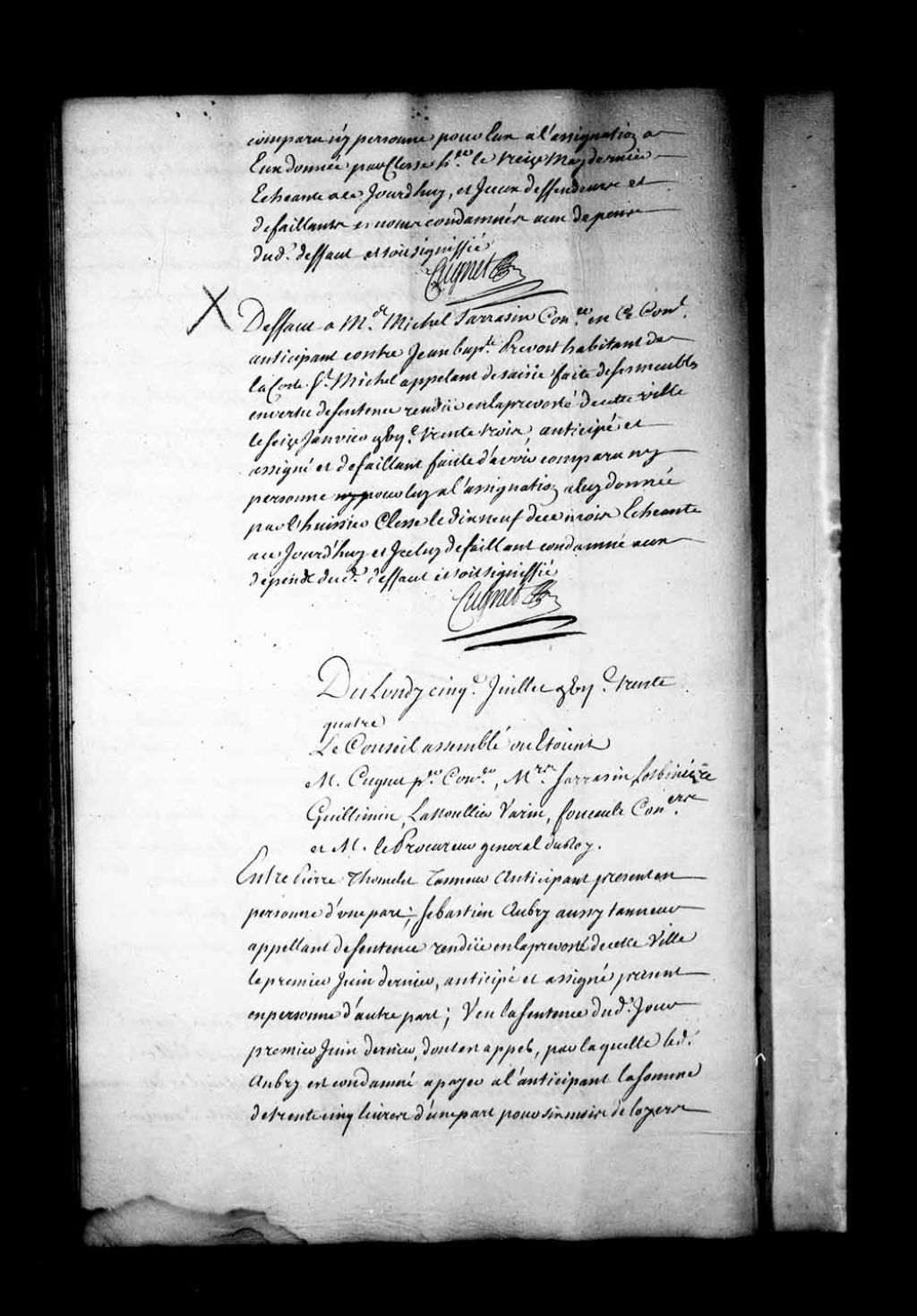 Arrêt qui accorde défaut à Michel Sarrazin, conseiller en ce Conseil, contre Jean-Baptiste Prévost, habitant de la côte Saint-Michel et appelant de la saisie faite de ses meubles, en vertu de la sentence rendue en la Prévôté de Québec, le 16 janvier 1733