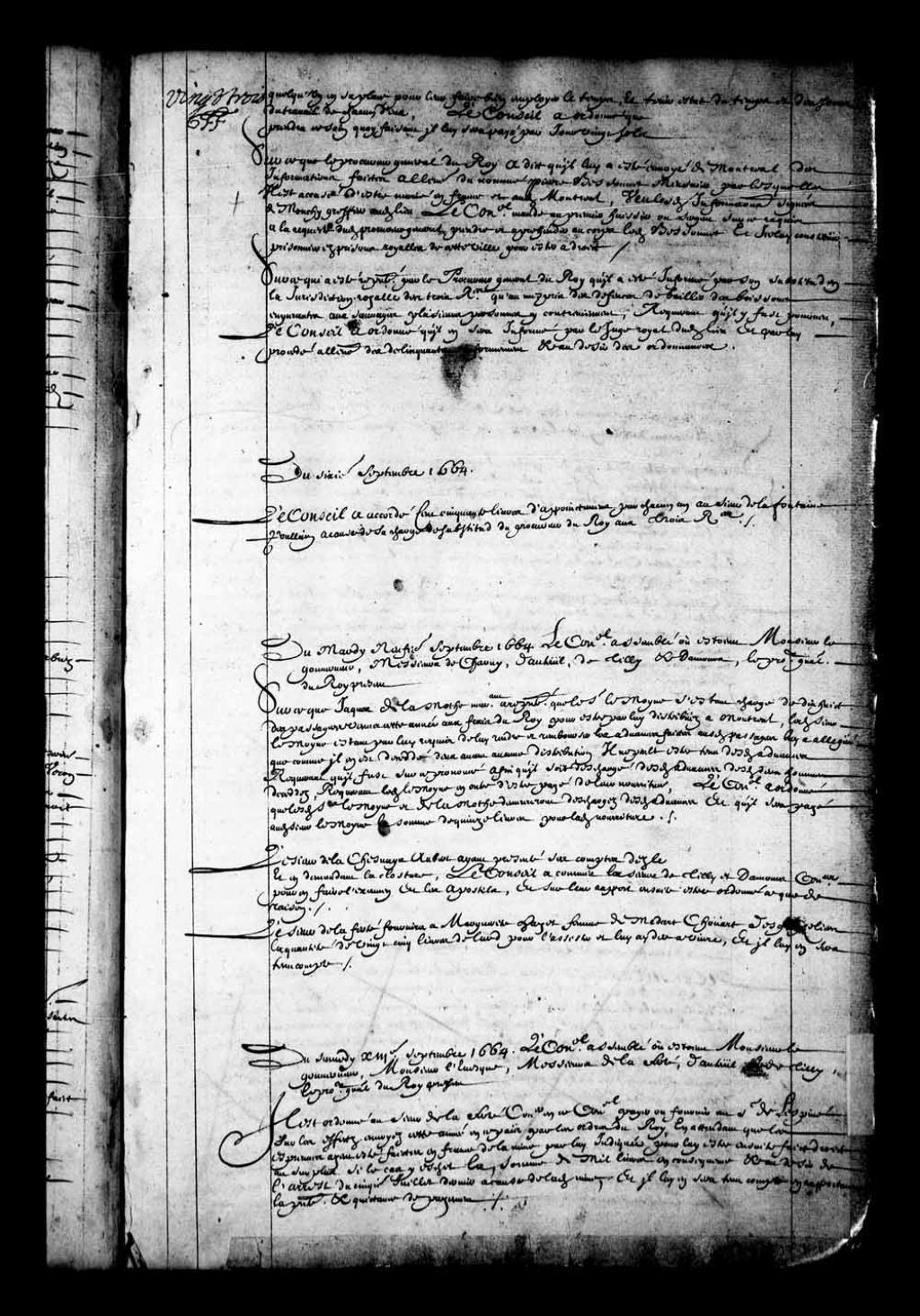 Arrêt ordonnant au juge des Trois-Rivières, d'informer et procéder contre ceux qui vendent des boissons enivrantes aux sauvages (Amérindiens), 3 septembre 1664, Archives nationales à Québec, Fonds Conseil souverain, (03Q,TP1,S28,P180).