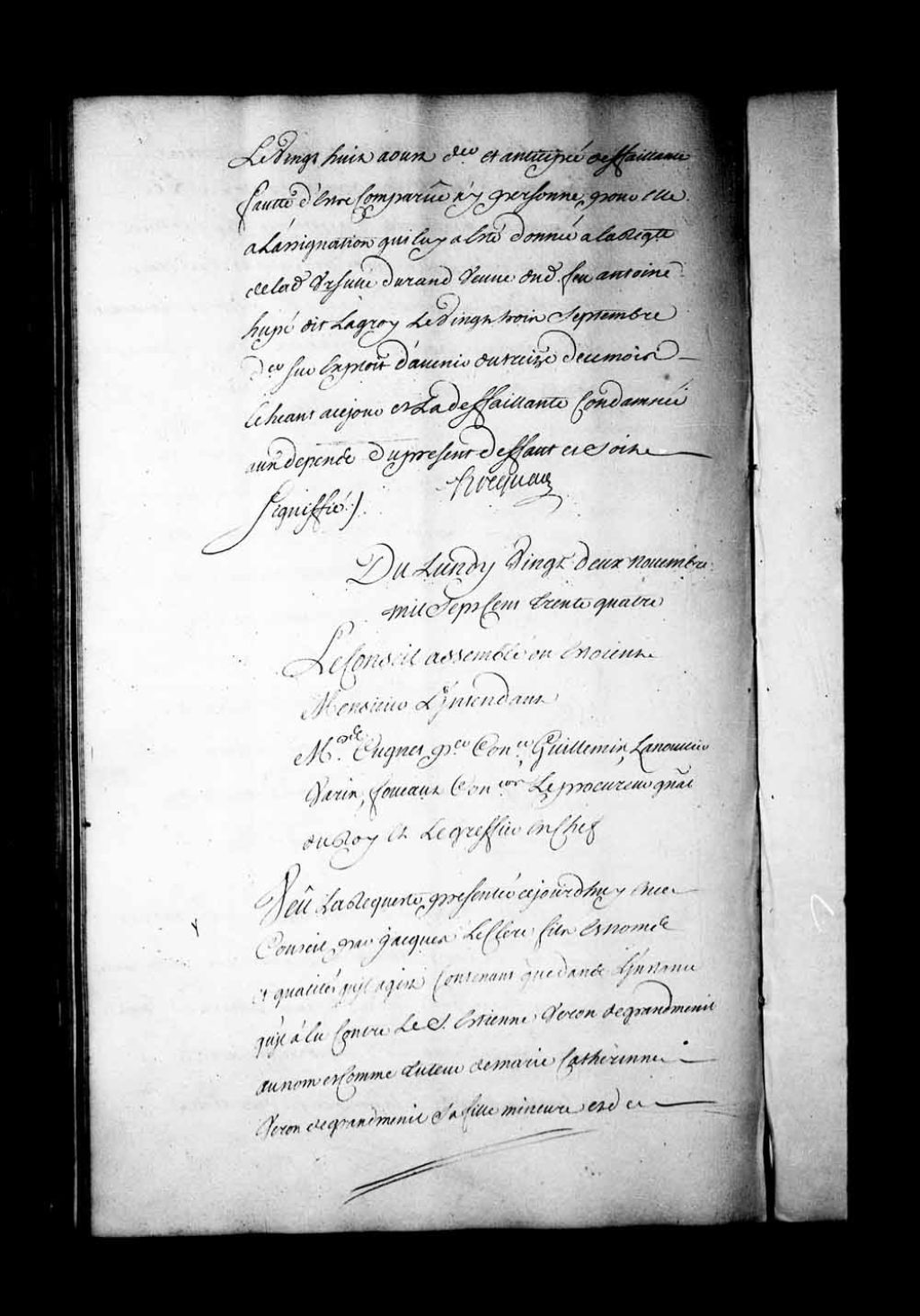 Arrêt qui renvoie Jacques Leclerc fils, aux noms et qualité qu'il agit à se pourvoir aux fins de sa requête, d'aujourd'hui, en la Prévôté de Québec, dans sa cause contre Étienne Veron de Grandmesnil au nom et comme tuteur de Marie-Catherine Veron de Grandmesnil, sa fille mineure, contre Marie-Louise Reiche, 22 novembre 1734, Archives nationales à Québec, Fonds Conseil souverain, (03Q,TP1,S28,P18060).
