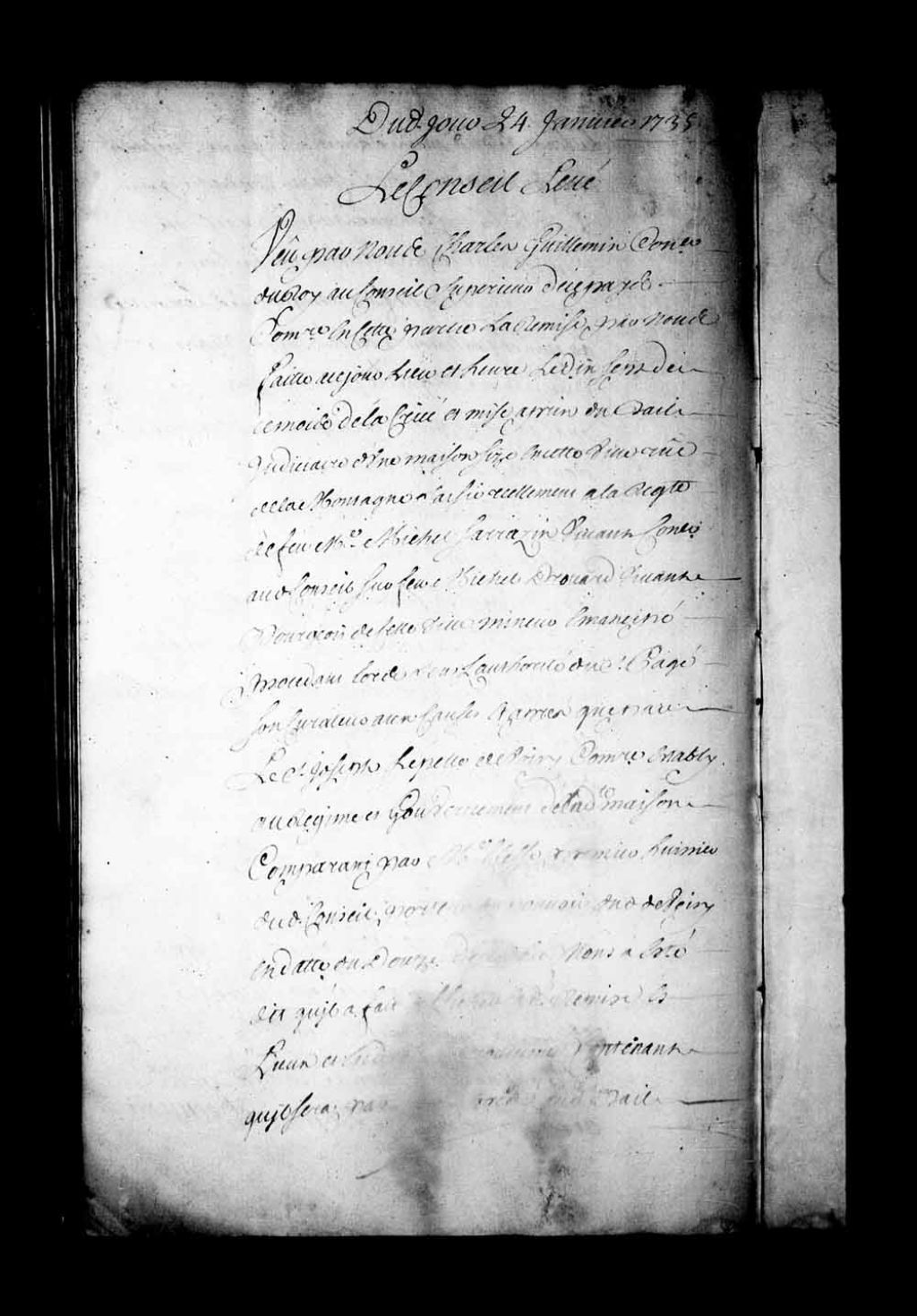 Criée et adjudication du bail judiciaire d'une maison située à Québec, côte de la Montagne, saisie réellement à la requête de feu Michel Sarrazin sur feu Michel Drouard. La vente est remise au premier lundi de mars prochain, 24 janvier 1735, Archives nationales à Québec, Fonds Conseil souverain, (03Q,TP1,S28,P18098).
