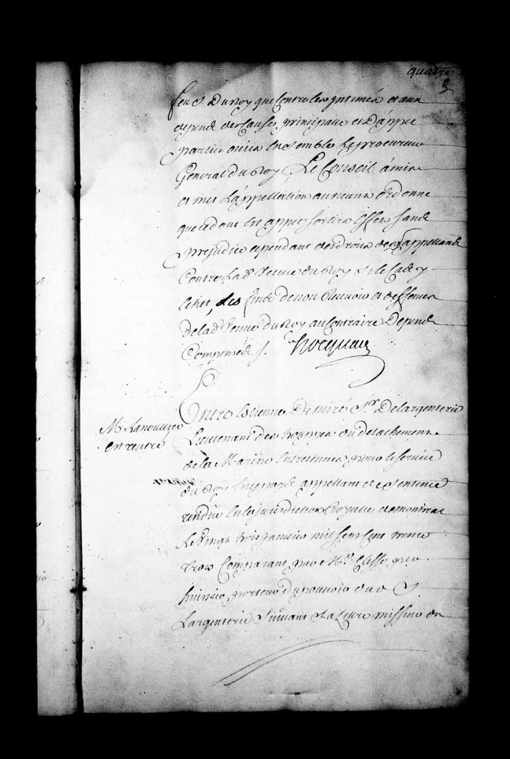 Arrêt qui appointe les parties en droit à écrire et produire dans les délais de l'ordonnance par-devant François Foucault, conseiller, dans l'instance entre Étienne de Miray, sieur de Largenterie, lieutenant dans les troupes, appelant de la sentence rendue en la Juridiction de Montréal du 23 janvier 1733, contre Benoît Basset, comparant par Pierre Pilote, 31 janvier 1735, Archives nationales à Québec, Fonds Conseil souverain, (03Q,TP1,S28,P18101).