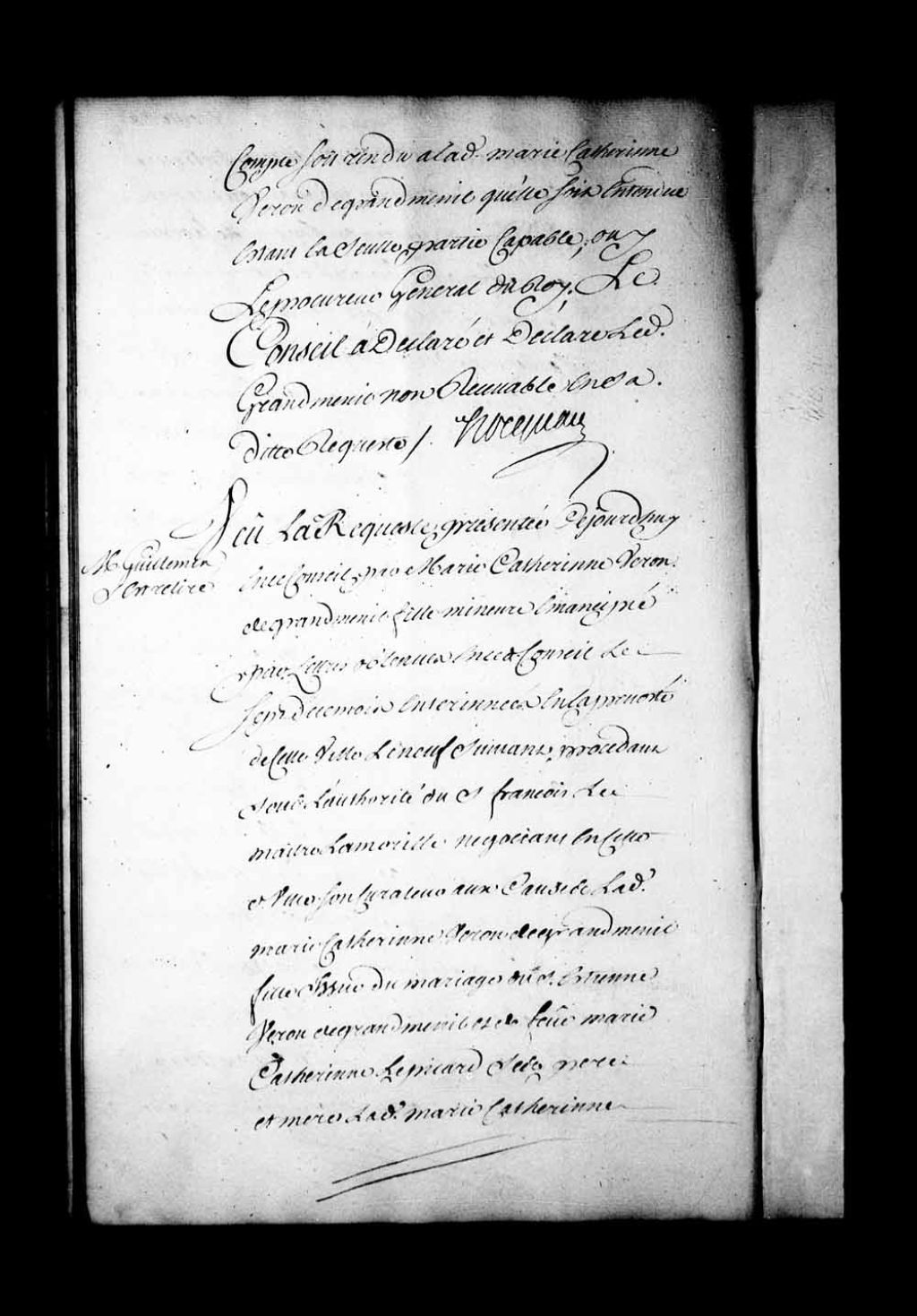 Arrêt qui sursoit à faire droit quant à présent sur les conclusions de la requête de Marie-Catherine Veron de Grandmesnil, fille mineure émancipée, procédant sous l'autorité de François Lemaître Lamorille, son curateur, au sujet de l'entérinement des lettres de rescision et restitution par elle obtenues etc., etc, 14 février 1735, Archives nationales à Québec, Fonds Conseil souverain, (03Q,TP1,S28,P18114).