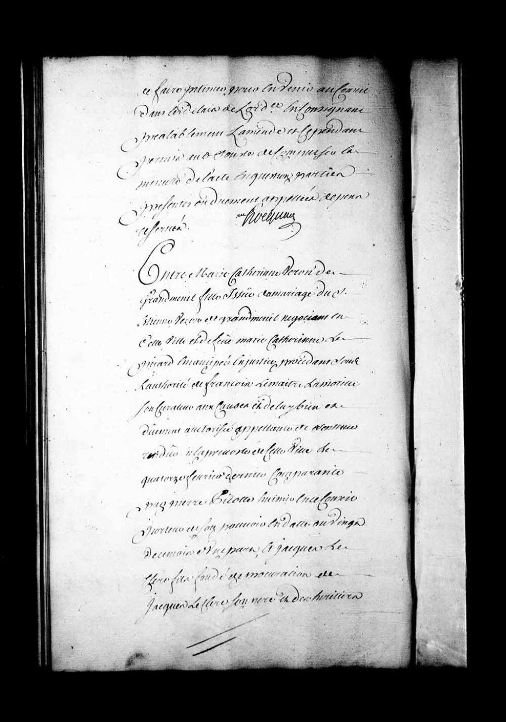Appel mis à néant et ce dont est appel au néant dans l'instance entre Marie-Catherine Veron de Grandmesnil, fille issue du mariage de Étienne Veron de Grandmesnil et de feue Catherine Lepicard, appelante de la sentence rendue en la Prévôté de Québec, le 14 février dernier, et Jacques Leclerc, fondé de procuration de Jacques Leclerc, son père, et des héritiers de la Maignière; émendant, ordonné que l'instance pendante à la Prévôté de Québec entre le sieur Lemaître Lamorille, au nom et comme tuteur de l'appelante, contre Jacques Leclerc sera tenue pour reprise avec la dite Catherine Veron de Grandmesnil, etc., etc, 21 mars 1735, Archives nationales à Québec, Fonds Conseil souverain, (03Q,TP1,S28,P18132).