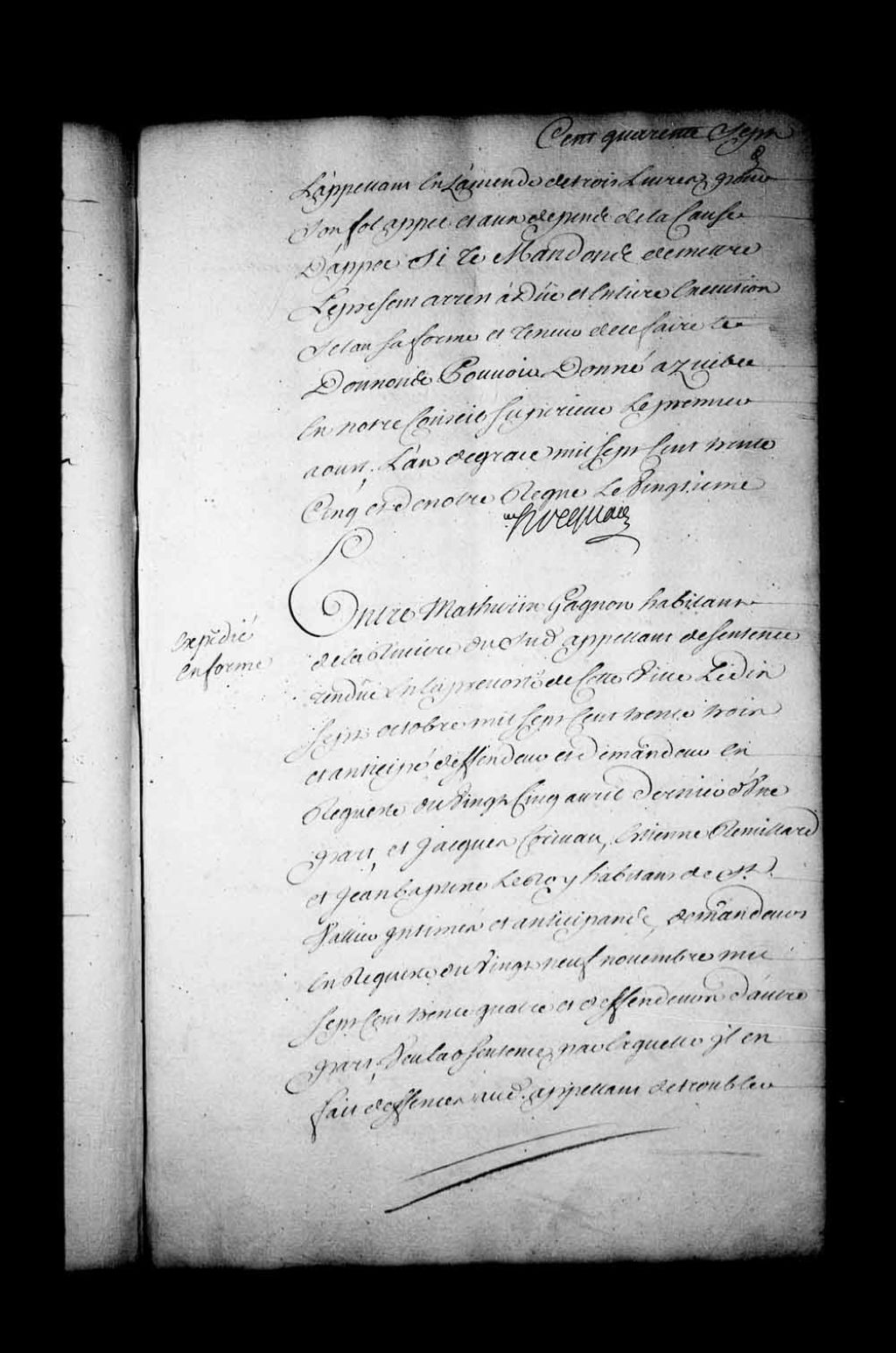 - Appel mis à néant dans la cause entre Mathurin Gagnon, habitant de la Rivière-du-Sud (appelant de la sentence rendue en la Prévôté de Québec du 17 octobre 1733), et Jacques Corriveau, Étienne Rémillard et Jean-Baptiste Leroy, habitants de Saint-Vallier; parties mises hors de cour et cependant a condamné solidairement Jacques Corriveau et Étienne Rémillard en vingt livres d'amende applicables à la paroisse de la dite seigneurie pour la voie de fait par eux commise, de laquelle amende le marguillier en charge sera tenu de se charger, etc., etc