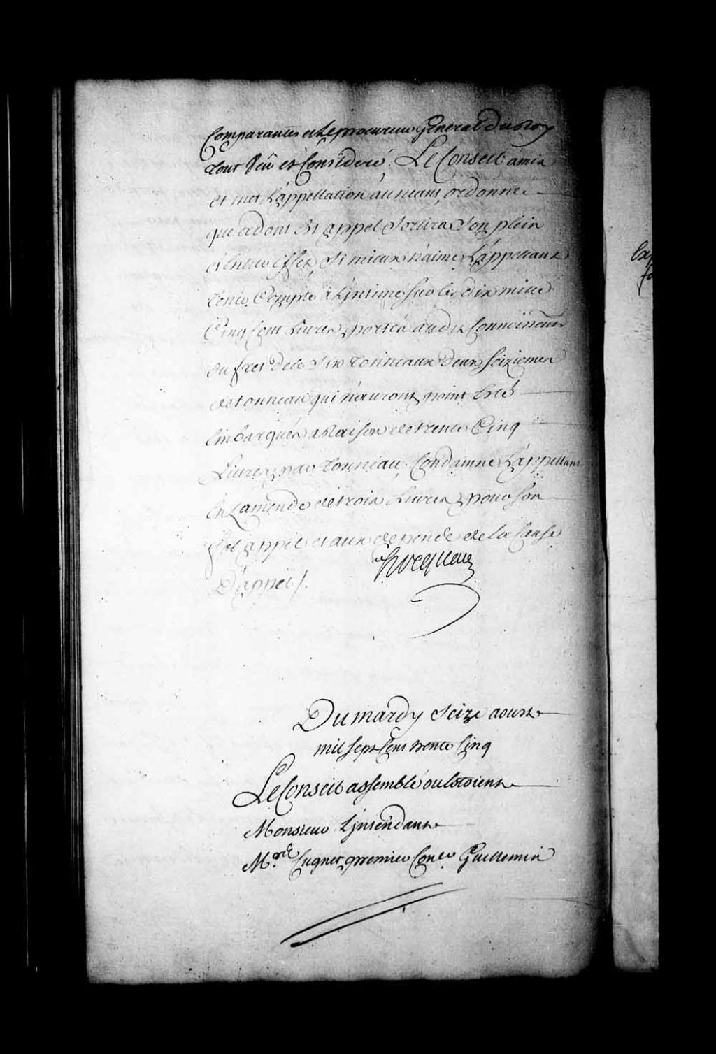 - Appel mis à néant dans l'instance entre Jacques Raineau, capitaine du navire le Comte de Toulouse, de La Rochelle (appelant de sentence de l'Amirauté de Québec du 3 de ce mois) et Jean Boureau, second du dit navire, Claude Dubosq, premier pilote, François Duverger, chirurgien, et Sibille Herbert, pilotin; émendant, a réglé à chacun des dits Boureau, Dubosq, Duverger et Herbert la somme de 45 livres par mois pour leur nourriture, etc., etc
