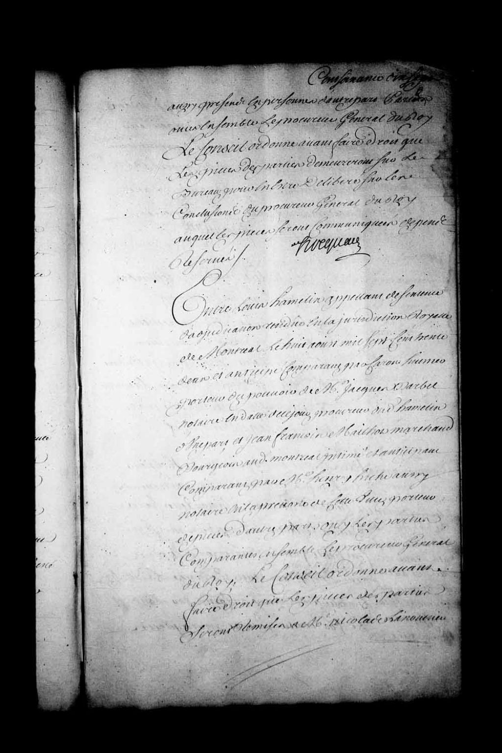 Arrêt qui ordonne avant faire droit que les pièces des parties seront remises à Nicolas Lanouillier, conseiller, pour en être délibéré, dans l'affaire entre Louis Hamelin (appelant de sentence d'adjudication de la Juridiction de Montréal du 8 août 1732), et Jean-François Mailhiot (Malhiot), marchand bourgeois à Montréal; le dit Hamelin ou son procureur pourra prendre si bon lui semble communication des pièces du procès entre les mains du sieur Lanouillier, 5 septembre 1735, Archives nationales à Québec, Fonds Conseil souverain, (03Q,TP1,S28,P18205).
