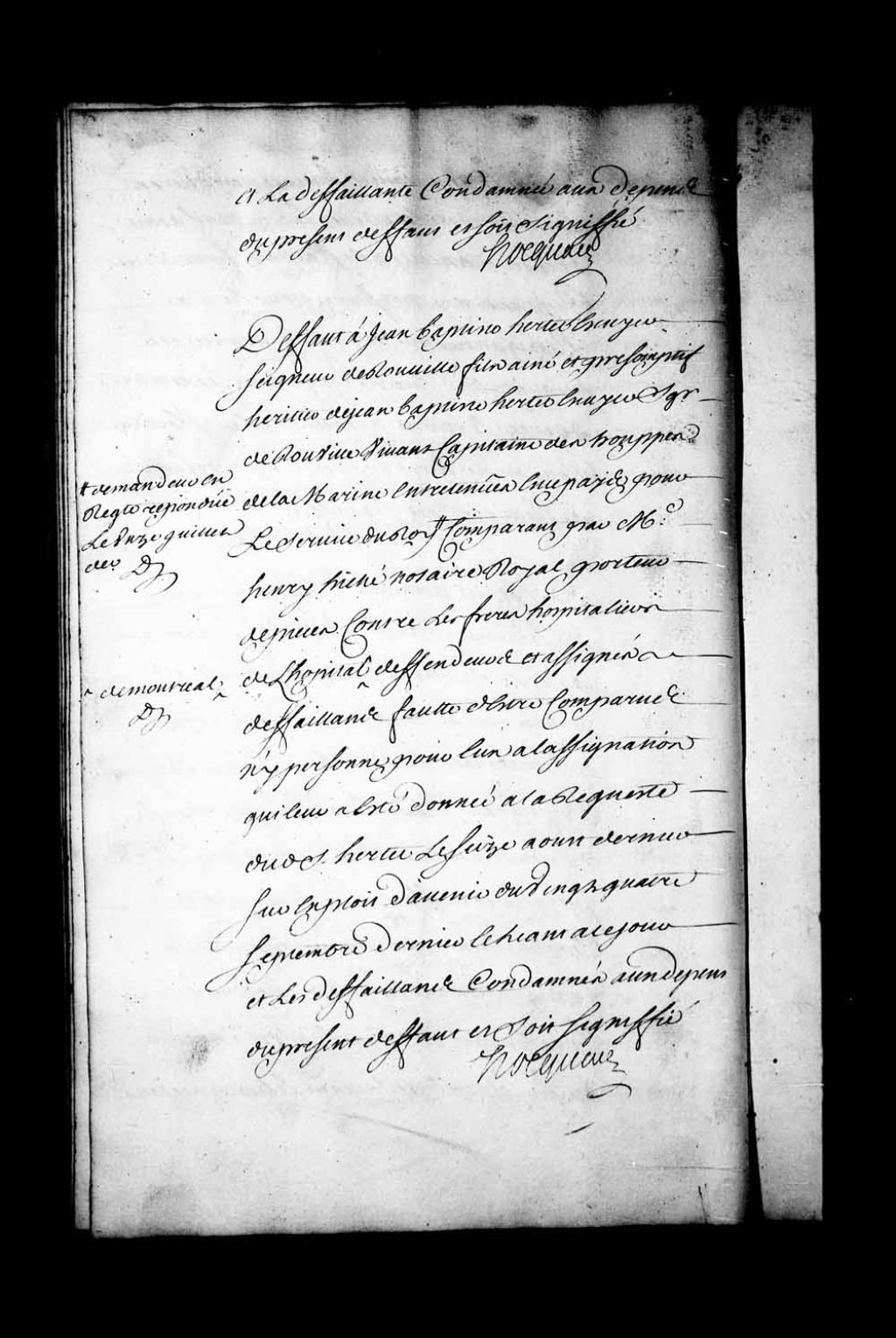 Arrêt qui accorde défaut à Jean-Baptiste Hertel de Rouville, fils aîné et présomptif héritier de Jean-Baptiste Hertel de Rouville, capitaine dans les troupes, contre les Frères Hospitaliers de l'Hôpital de Montréal