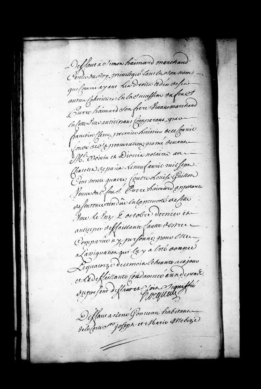 Arrêt qui accorde défaut à Simon Haimard (Aymard) (Aymard)(Aymard), marchand cartier (cartes à jouer) du Roi (cartes à jouer), tant en son nom que comme ayant les droits cédés de ses autres cohéritiers en la succession de feu Pierre Haimard (Aymard) (Aymard), son frère, marchand à Québec, comparant par François Clesse, premier huissier, contre Louise Guillot, veuve du dit feu Pierre Haimard (Aymard) et appelante de la sentence rendue en la Prévôté de Québec, le 11 octobre 1735