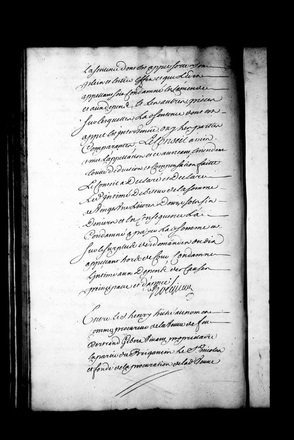 Arrêt qui reçoit Henry Hiché au nom et comme procureur de la veuve Bertrand Gibert, propriétaire en partie du brigantin « Le Saint-Nicolas », et le sieur Nicolas Philibert, marchand de Québec, associé du dit Gibert, appelants de la sentence, du 5 octobre 1735, en faveur de Étienne Gaignier, menuisier à Québec. Faisant droit sur le dit appel, le Conseil met l'appellation à néant et condamne les dits appelants à payer au dit Gaignier la somme de 44 livres et aux dépens, 19 décembre 1735, Archives nationales à Québec, Fonds Conseil souverain, (03Q,TP1,S28,P18268).