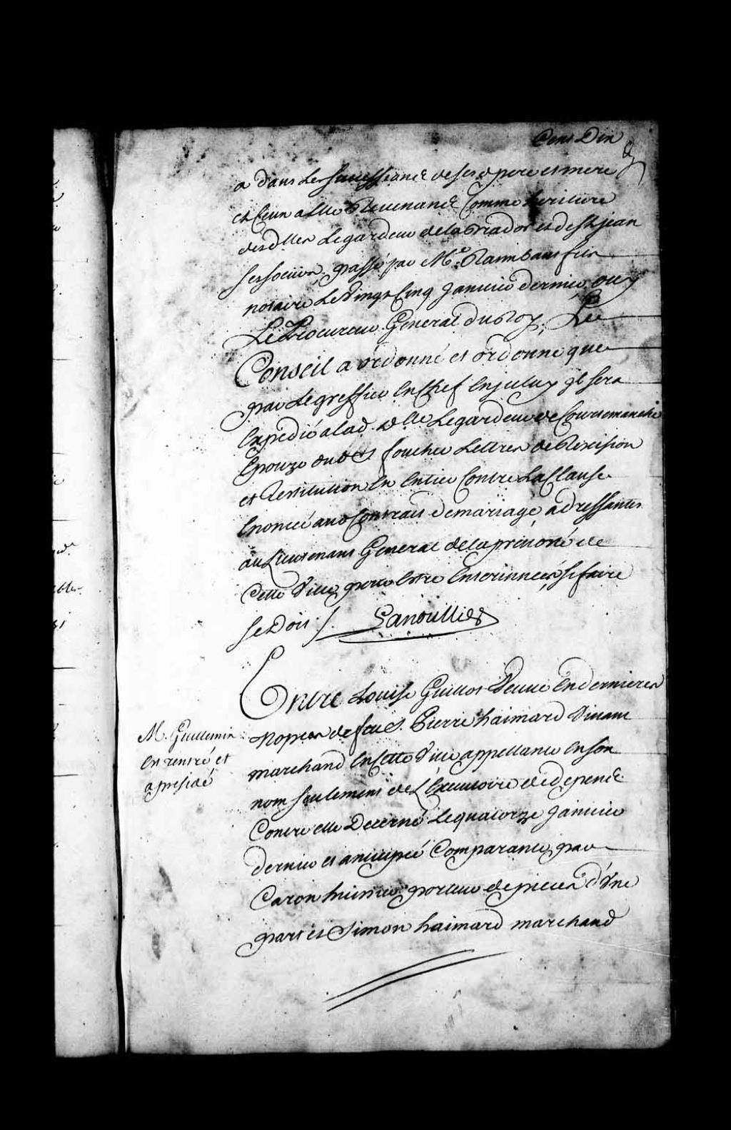 Arrêt qui ordonne, pour faire droit aux parties, que leurs pièces seront remises à Jean-Victor Varin, conseiller, dans la cause entre Louise Guillot, veuve en dernières noces de Pierre Haimard (Aymard) et appelante en son nom de l'exécutoire de dépens décernés contre elle, le 14 janvier 1736, et Simon Haimard (Aymard), marchand cartier (cartes à jouer) du Roi (cartes à jouer), ayant les droits cédés de ses autres cohéritiers en la succession du dit feu sieur Pierre Haimard, 6 février 1736, Archives nationales à Québec, Fonds Conseil souverain, (03Q,TP1,S28,P18283).
