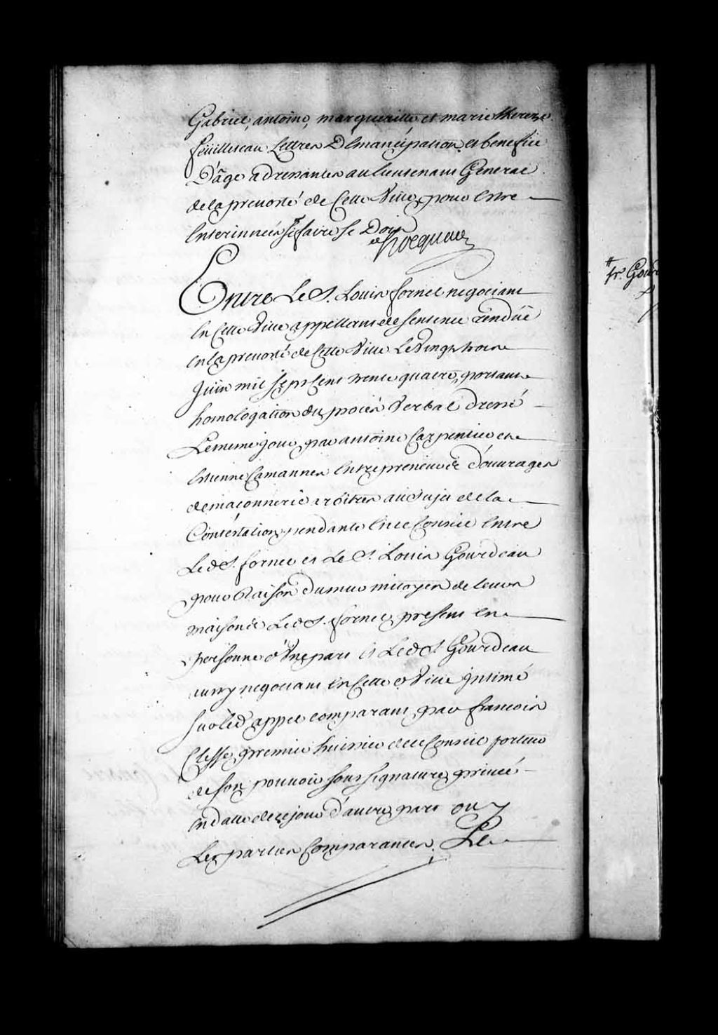 Arrêt qui ordonne que les pièces des parties seront remises à Jean Victor Varin, conseiller, pour en être délibéré dans l'affaire entre Louis Fornel, négociant à Québec et appelant de la sentence rendue en la Prévôté de Québec, le 23 juin 1734, contre Louis Gourdeau. Procès à propos d'un mur mitoyen, 7 mai 1736, Archives nationales à Québec, Fonds Conseil souverain, (03Q,TP1,S28,P18335).