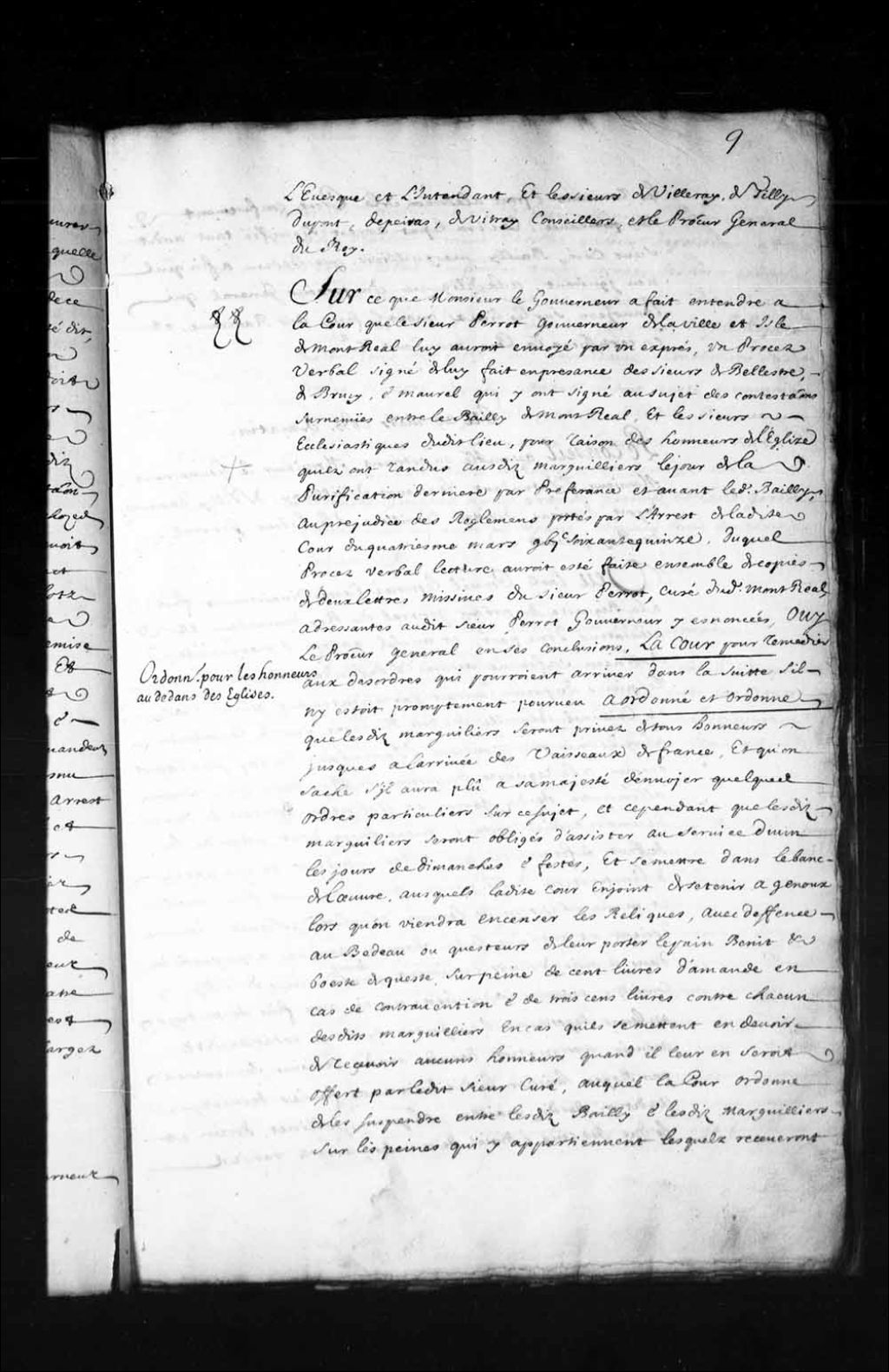 - Transcription du texte avec orthographe modernisée : «Du vingtième mars 1677 du matin. La Cour assemblée où étaient Messieurs le gouverneur, l'évêque et l'intendant, et les sieurs de Villeray, de Tilly, Dupont, Depeiras, de Vitray conseillers et le procureur général du Roi. Sur ce que Monsieur le gouverneur a fait entendre à la Cour que le sieur Perrot gouverneur de la ville et île de Montréal lui aurait envoyé par un exprès, un procès-verbal signé de lui fait en présence des sieurs de Bellestre, de Brucy et maurel qui y ont signé au sujet des contestations survenues entre le bailli de Montréal et les sieurs ecclésiastiques dudit lieu pour raison des honneurs de l'église qu'ils ont rendus auxdits marguilliers le jour de la purification dernière par préférence et avant ledit Bailli, au préjudice des règlements portés par l'arrêt de ladite Cour du quatrième mars mille six cent soixante-quinze duquel procès-verbal lecture aurait été faite ensemble de copies de deux lettres missives du sieur Perrot, curé dudit Montréal, adressantes audit sieur Perrot gouverneur y énoncées, ouï le procureur général en ses conclusions, la Cour pour remédier aux désordres qui pourraient arriver dans la suite s'il n'y était promptement pourvu a ordonné et ordonne que lesdits marguilliers seront privés de tous honneurs jusqu'à l'arrivée des vaisseaux de France et qu'on sache s'il aura plu à sa Majesté d'envoyer quelques ordres particuliers sur ce sujet, et cependant que lesdits marguilliers seraient obligés d'assister au service divin les jours de dimanches et les fêtes, et ce mettre dans le banc de l'oeuvre auxquels ladite Cour enjoint de se tenir à genoux lorsqu'on viendra encenser les reliques, avec défense au Bedeau ou quêteur de leur porter le pain bénit et boîte de quête sur peine de cent livres d'amende en cas de contravention et de trois cents livres courants a chacun desdits marguilliers en cas qu'ils se mettent en devoir de recevoir aucunes honneurs quand il leur en serait offert par ledit sieur curé, auquel la Cour ordonne de les suspendre entre ledit Bailli et lesdits marguilliers sur les peines qui y appartiennent, lesquels recevront les rameaux et iront a l'adoration de la Croix confusément sans préséance, et sera le présent arrêt signifié tant audit sieur curé, Bailli, marguilliers, que Bedeau afin qu'il n'en ignorent, à la diligence du procureur général qui l'enverra sur les lieux avant la fête des Rameaux, et en certifiera la Cour, mandons. DUCHESNEAU.»