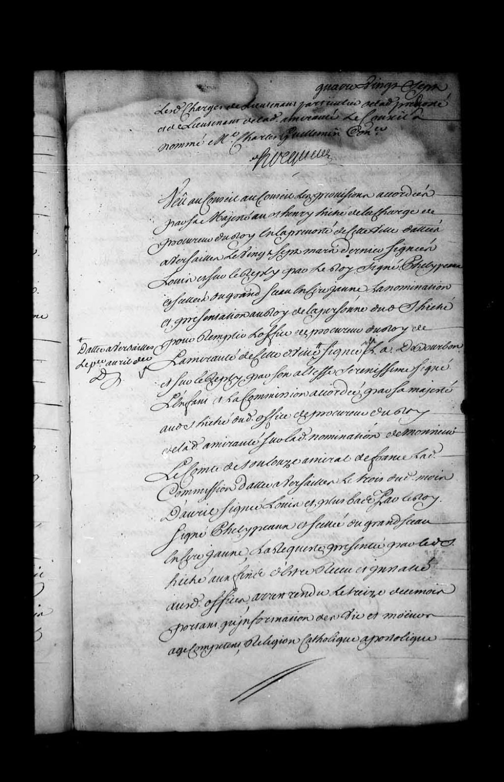 Arrêt qui reçoit Henry Hiché en l'office de procureur du Roi de la Prévôté de Québec et ordonne que ses provisions, nominations et commissions seront enregistrées aux registres du Conseil, 20 août 1736, Archives nationales à Québec, Fonds Conseil souverain, (03Q,TP1,S28,P18384).