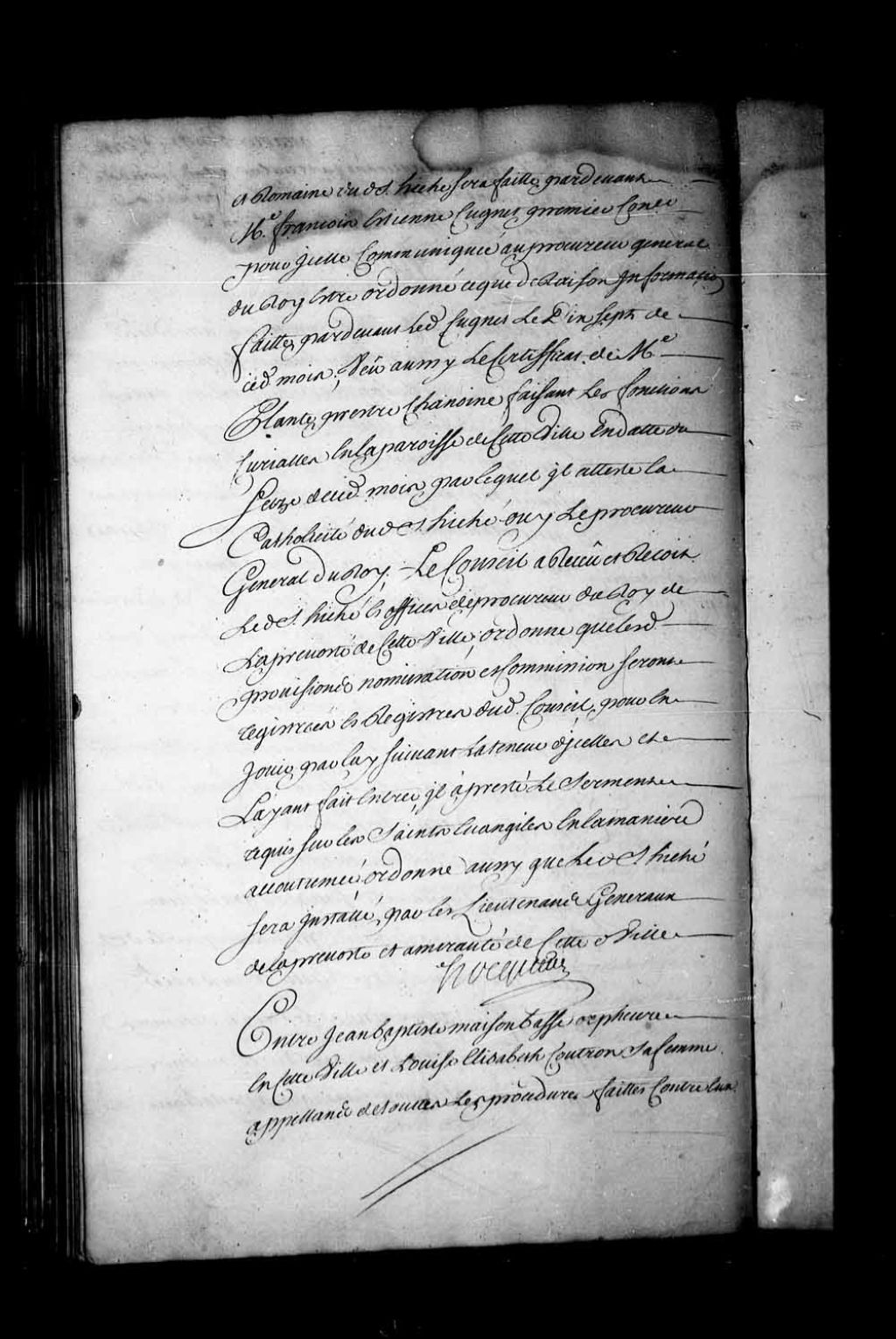 Appel mis à néant dans l'affaire entre Jean-Baptiste Maisonbasse, orfèvre à Québec, et Louise-Elisabeth Courteron, sa femme (appelante de toutes les procédures faites contre eux concernant le décret de leur maison sise à la Basse-Ville de Québec) et Paul Crespin (Crépin), négociant en la ville de Bordeaux, faisant tant pour lui que pour ses autres cohéritiers en la succession de Jean Crespin (Crépin), 20 août 1736, Archives nationales à Québec, Fonds Conseil souverain, (03Q,TP1,S28,P18385).