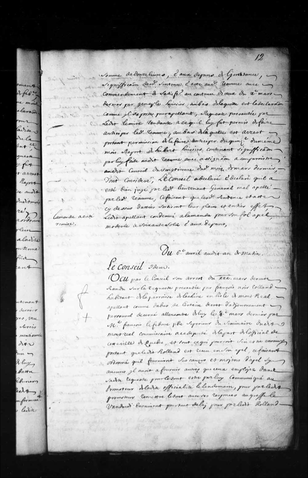Transcription du texte avec orthographe modernisée : «Du 6e avril audit an de matin. Le Conseil Idem. Vu par le Conseil son arrêt du 30e mars dernier rendu sur la requête présentée par François Noir Rolland habitant de la paroisse de Lachine en l'île de Montréal appelant comme d'abus de certain décret d'ajournement personnel décerné à l'encontre de lui le 4e mars dernier par messire François Lefebvre prêtre supérieur du séminaire dudit Montréal commissaire à ce député de la part de l'official de cette ville de Québec, et tout ce qui pourrait s'en être ensuivi, portant que ledit Rolland est reçu en son appel, ce faisant ordonné qu'il fournirait ses causes et moyens d'appel si aucuns il avait à fournir autres que ceux employés dans sa dite requête pour le tout être par lui communiqué au promoteur de ladite officialité le lendemain pour par ledit promoteur remettre le tout avec ses réponses au greffe le vendredi ensuivant pour tout délai [...]