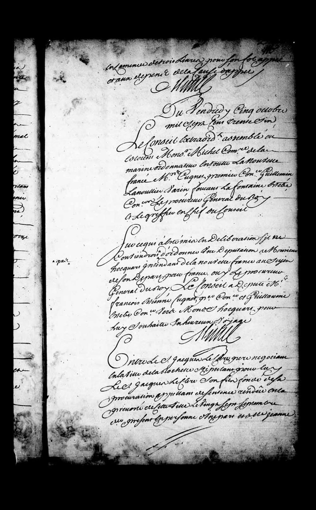 Arrêt qui ordonne une députation à M. Hocquart, intendant de la Nouvelle-France, au sujet de son départ pour France. Le Conseil a député Monsieur François-Étienne Cugnet, premier conseiller, et Guillaume Estèbe, conseiller, vers M. Hocquart pour lui souhaiter un heureux voyage