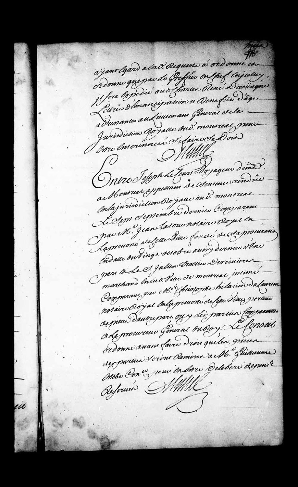 Arrêt qui ordonne, avant de faire droit, que les pièces des parties seront remises à Guillaume Estèbe, conseiller, dans la cause entre Joseph Lecourt, voyageur de Montréal et appelant de la sentence rendue en la Juridiction de Montréal, le 7 septembre 1736, comparant par Jean Latour, notaire royal, contre Julien Trottier Desrivières, marchand à Montréal, comparant par Christophe-Hilarion Dulaurent, 12 novembre 1736, Archives nationales à Québec, Fonds Conseil souverain, (03Q,TP1,S28,P18400).