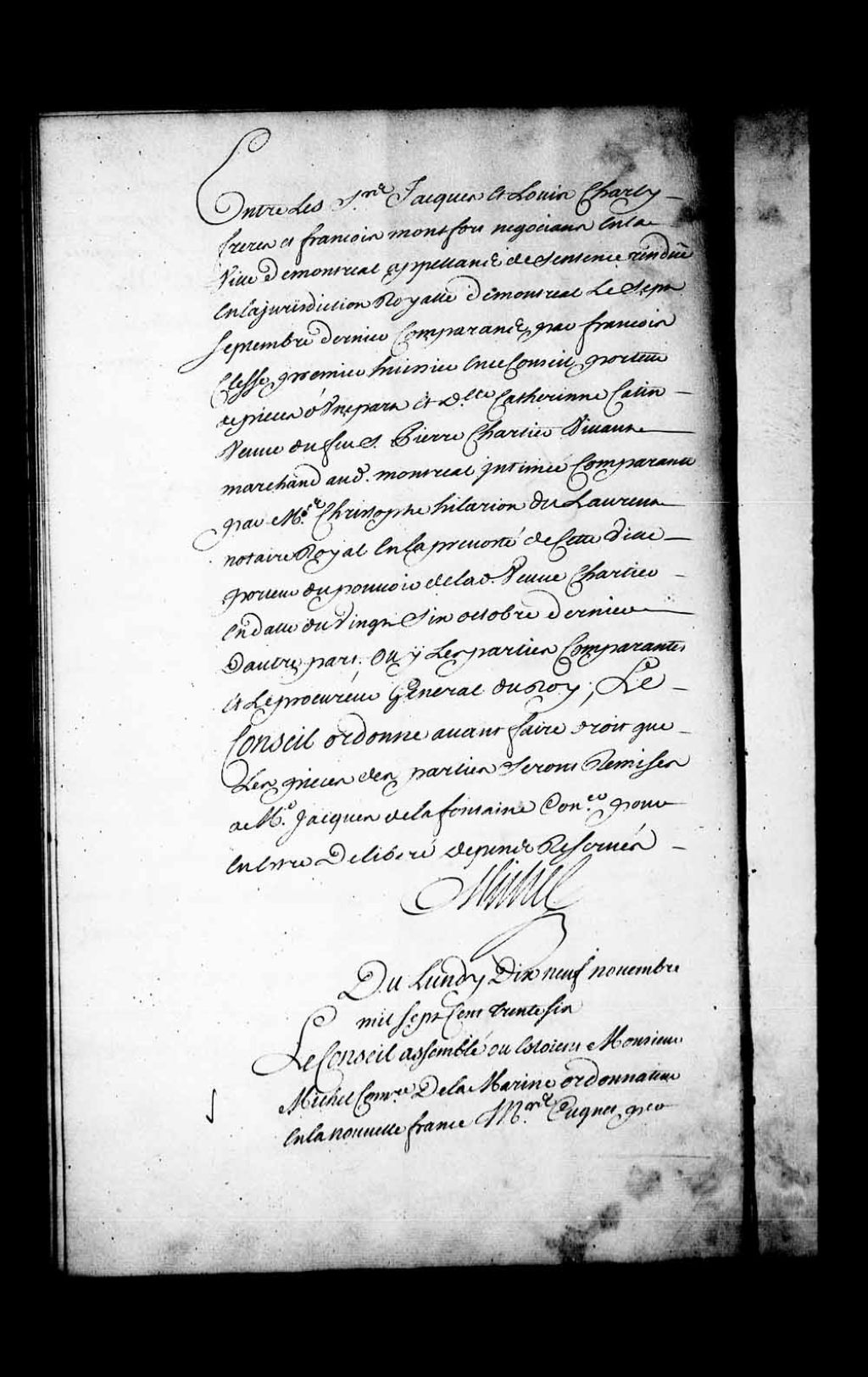 - Arrêt qui autorise Étienne Veron de Grandmesnil, négociant de Québec, veuf de Marie-Catherine Lepicard, et Marie-Catherine Veron de Grandmesnil, sa fille, mineure émancipée, à faire vendre la terre et habitation de Louis Javillon dit Lafeuillade située en l'île Carillon pour une dette de 1 300 livres