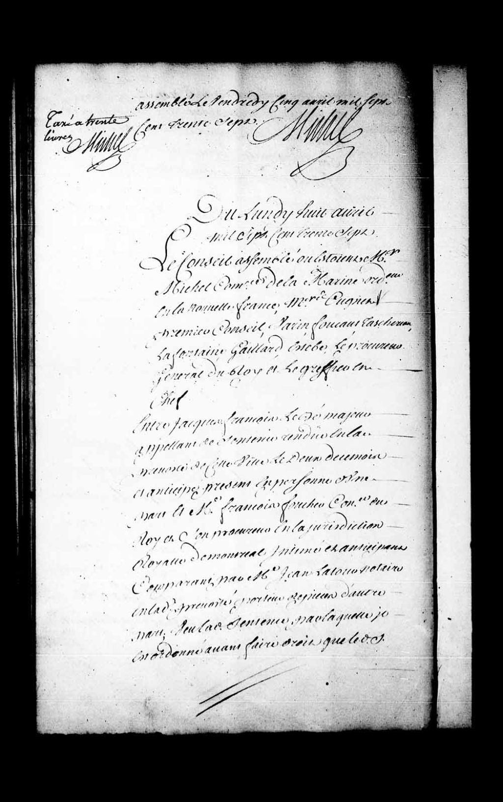 Appel mis à néant de la sentence rendue en la Prévôté de Québec, le 2 avril 1737, dans l'affaire entre Jacques-François LeBé, majeur, contre François Foucher, procureur en la Juridiction de Montréal. LeBé est condamné en 3 livres pour son « fol appel », 8 avril 1737, Archives nationales à Québec, Fonds Conseil souverain, (03Q,TP1,S28,P18465).