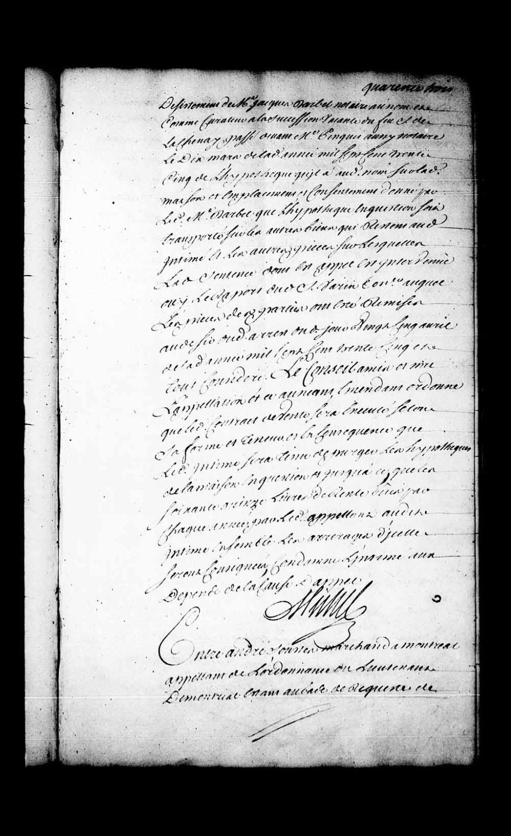 Appel mis à néant de l'ordonnance du lieutenant général de Montréal, datée du 19 juillet 1736, dans la cause entre André Souste, marchand à Montréal, contre Jean-Baptiste Boucher Belleville, entrepreneur des fortifications de Montréal, 8 avril 1737, Archives nationales à Québec, Fonds Conseil souverain, (03Q,TP1,S28,P18467).