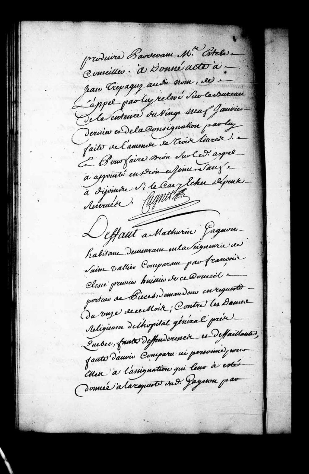 Arrêt qui accorde défaut à Mathurin Gagnon, habitant de Saint-Vallier (St-Vallier), contre les Dames religieuses de l'Hôpital général, près de Québec, 22 juillet 1737, Archives nationales à Québec, Fonds Conseil souverain, (03Q,TP1,S28,P18523).