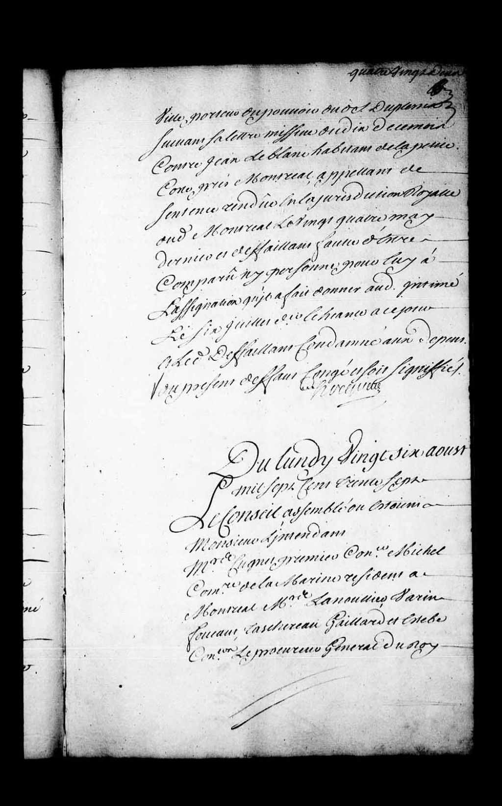 Arrêt qui ordonne d'enregistrer, dans les registres du Conseil, les lettres patentes de Sa Majesté, données à Versailles au mois d'avril 1737, signées Louis par lesquelles il est permis à la supérieure de l'Hôpital général de Québec de recevoir outre le nombre de vingt quatre religieuses fixé par les lettres patentes du mois d'avril 1720, dix autres religieuses et de recevoir six converses outre le nombre de quatre fixé par les lettres patentes du mois de mars 1717, 26 août 1737, Archives nationales à Québec, Fonds Conseil souverain, (03Q,TP1,S28,P18545).