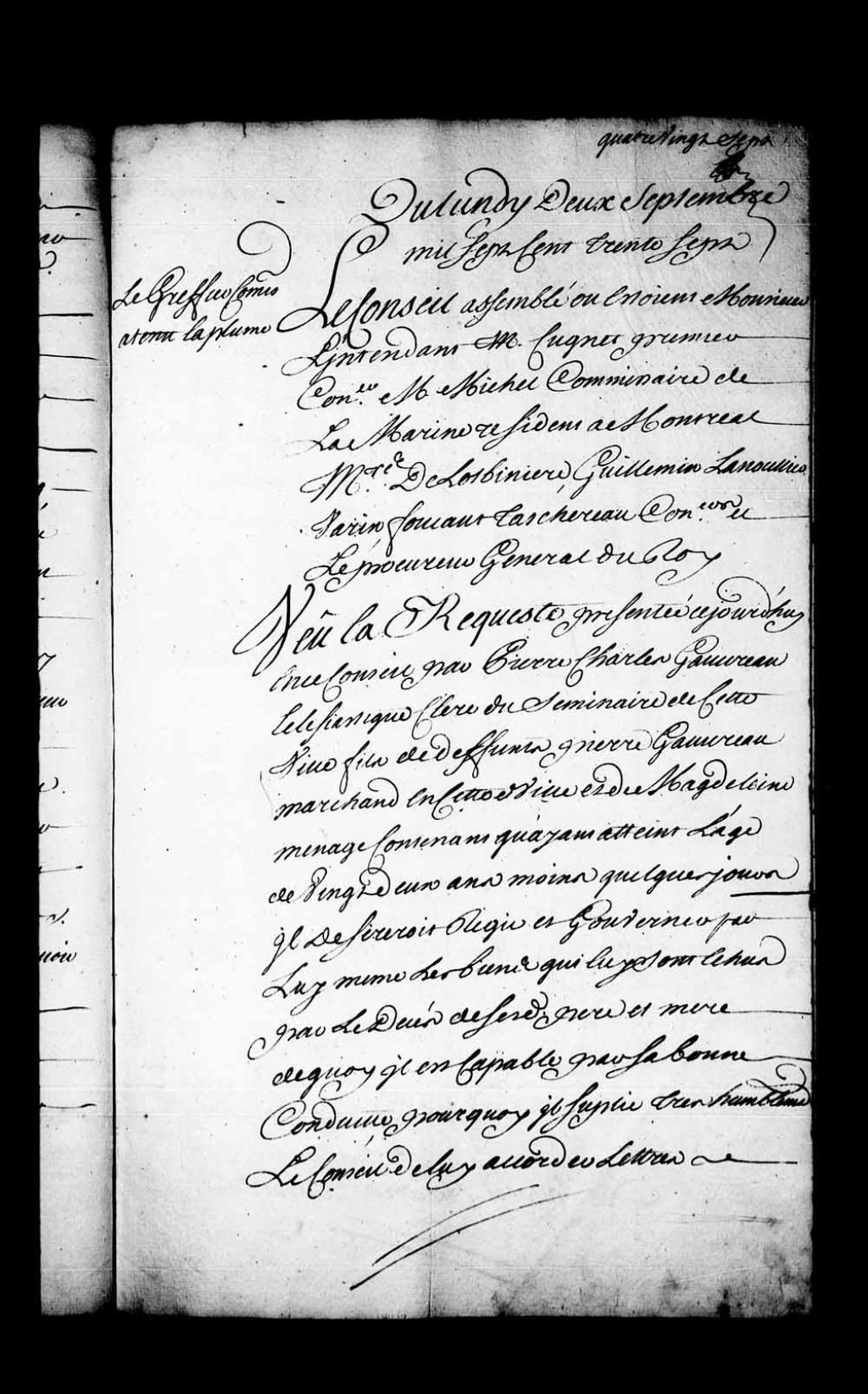 Arrêt qui ordonne, que par le greffier commis du Conseil Supérieur, qu'il sera expédié à Pierre-Charles Gauvreau, ecclésiastique clerc du Séminaire de Québec, âgé de 22 ans, fils de feu Pierre Gauvreau, marchand et de Madeleine Ménage, des lettres d'émancipation et de bénéfice d'âge, 2 septembre 1737, Archives nationales à Québec, Fonds Conseil souverain, (03Q,TP1,S28,P18550).