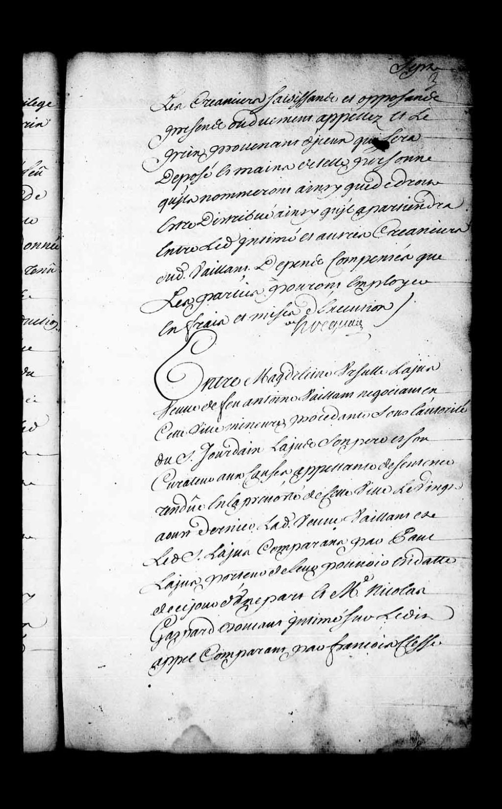 Arrêt qui reçoit Nicolas-Gaspard Boucault appelant d'une sentence de la Prévôté de Québec, du 2 septembre 1737, tient son appel pour bien relevé et avant de faire droit sur celui-ci, ordonne que le dit Boucault sera tenu dans trois jours de faire signifier ses griefs. Le tout, dans la cause entre le dit Boucault et Madeleine-Ursule Lajus, veuve de Antoine Vaillant, négociant à Québec, 16 septembre 1737, Archives nationales à Québec, Fonds Conseil souverain, (03Q,TP1,S28,P18558).