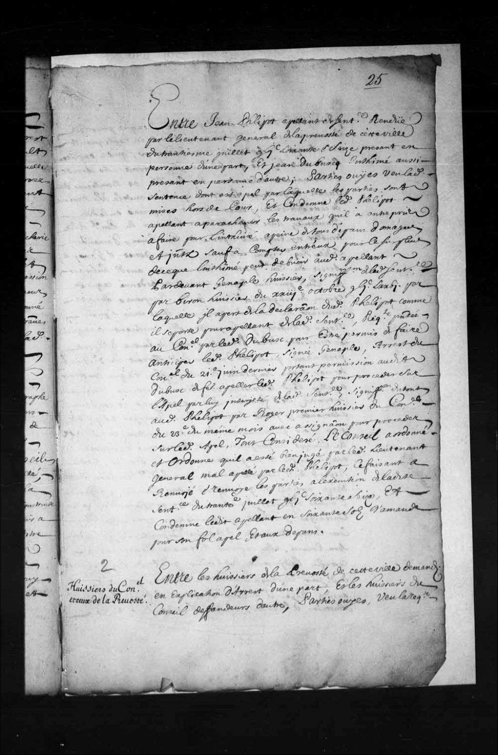 Transcription du texte avec orthographe modernisée : «Entre les huissiers de la prévôté de cette ville demandeurs en explication d'arrêt d'une part, et les huissiers du Conseil défendeurs d'autre. Parties ouïes vu la requête présentée par les huissiers de ladite prévôté à ce que pour les causes y contenues il plaise au Conseil en expliquant son arrêt du septième décembre dernier, qu'ils exploiteront par-devant lui, et qu'à l'avenir Ils mettront ses arrêts et ordonnances a exécution hors la ville et Banlieue de Québec, et par toutes les côtes qui sont au-delà de la Rivière de cette dite ville icelles n'étant comprises en ladite Banlieue, avec défenses aux huissiers du Conseil de les troubler ni empêcher à peine de cent livres d'amende, ladite requête signée, Levasseur, Biron, gosset et Genaple, arrêt du Conseil portant communication auxdits huissiers du Conseil pour leur réponse vue être ordonné ce que de raison du vingt-huitième juin [...]