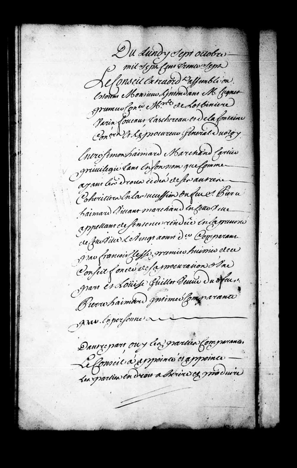 Arrêt qui appointe les parties en droit à écrire et produire, dans les délais de l'ordonnance, devant François-Étienne Cugnet, premier conseiller, dans la cause entre Simon Haimard (Aymard), marchand cartier (cartes à jouer), privilégié tant en son nom que comme ayant les droits cédés de ses autres cohéritiers en la succession de feu Pierre Haimard, appelant de la sentence rendue en la Prévôté de Québec, le 20 août 1737, contre Louise Guillot, veuve du dit feu sieur Pierre Haimard, 7 octobre 1737, Archives nationales à Québec, Fonds Conseil souverain, (03Q,TP1,S28,P18572).