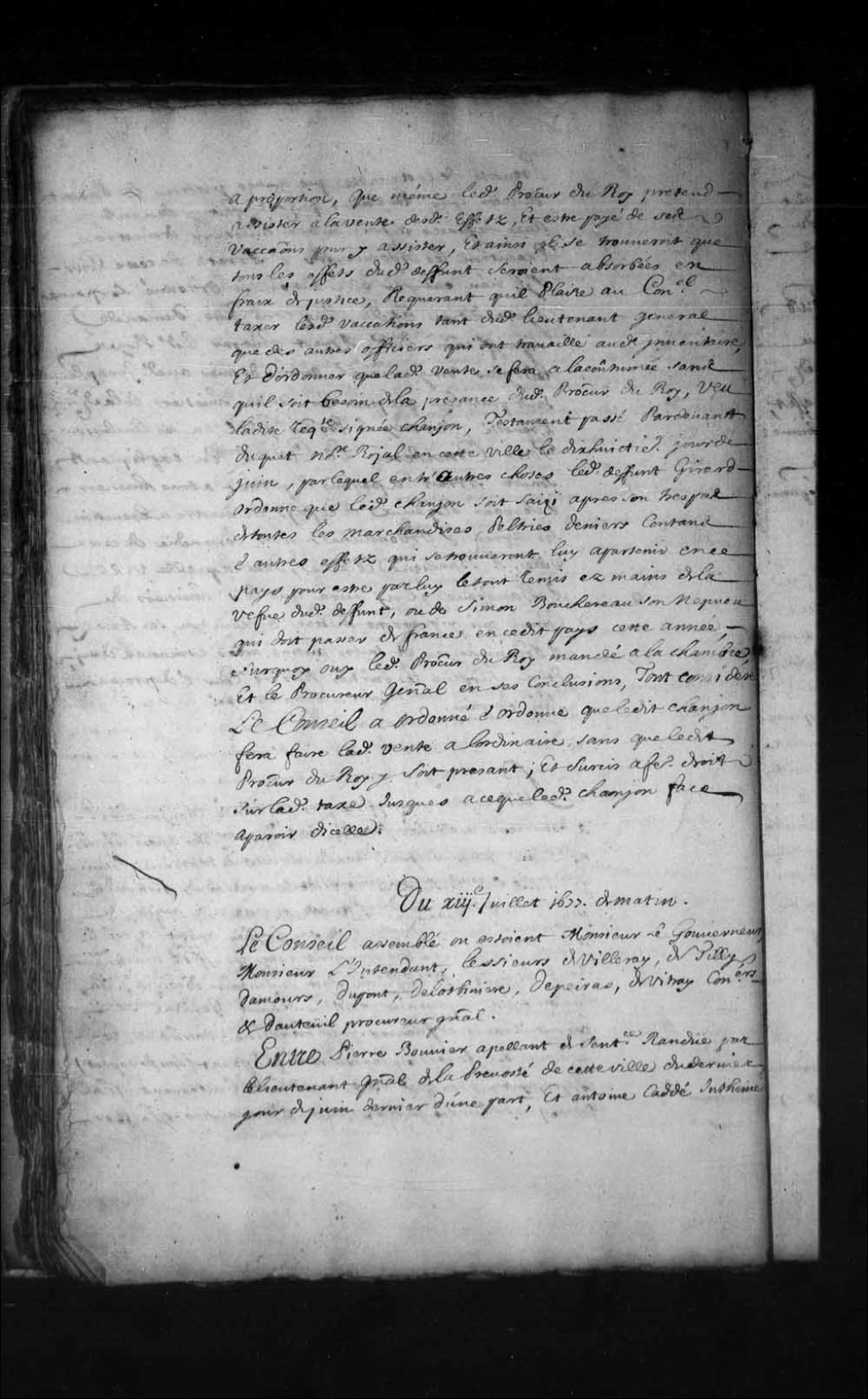 Transcription du texte avec orthographe modernisée : «Du 13e juillet 1677 de matin. Le Conseil assemblé où étaient Monsieur le gouverneur, Monsieur l'intendant, les sieurs de Villeray, de Tilly, Damours, Dupont, de Lotbinière, Depeiras, de Vitray conseillers et d'Auteuil procureur général. Entre Pierre BOUVIER appelant de sentence rendue par le lieutenant général de la prévôté de cette ville du dernier jour de juin dernier, d'une part, et Antoine Caddé intimé d'autre. Parties ouïes vu ladite sentence dont est appel par laquelle il est ordonné que ledit lieutenant général se transportera sur le lieu en question entre les parties pour savoir si la première concession est de soixante-dix pieds pour faire droit à qui il appartiendra maître Michel Fillion appelé pour se trouver samedi deux heures de relevée avec Jean LeRouge arpenteur, et faute de comparution par les parties auxdits lieu et heure sera fait droit tant présence qu'absence, ouï [...]