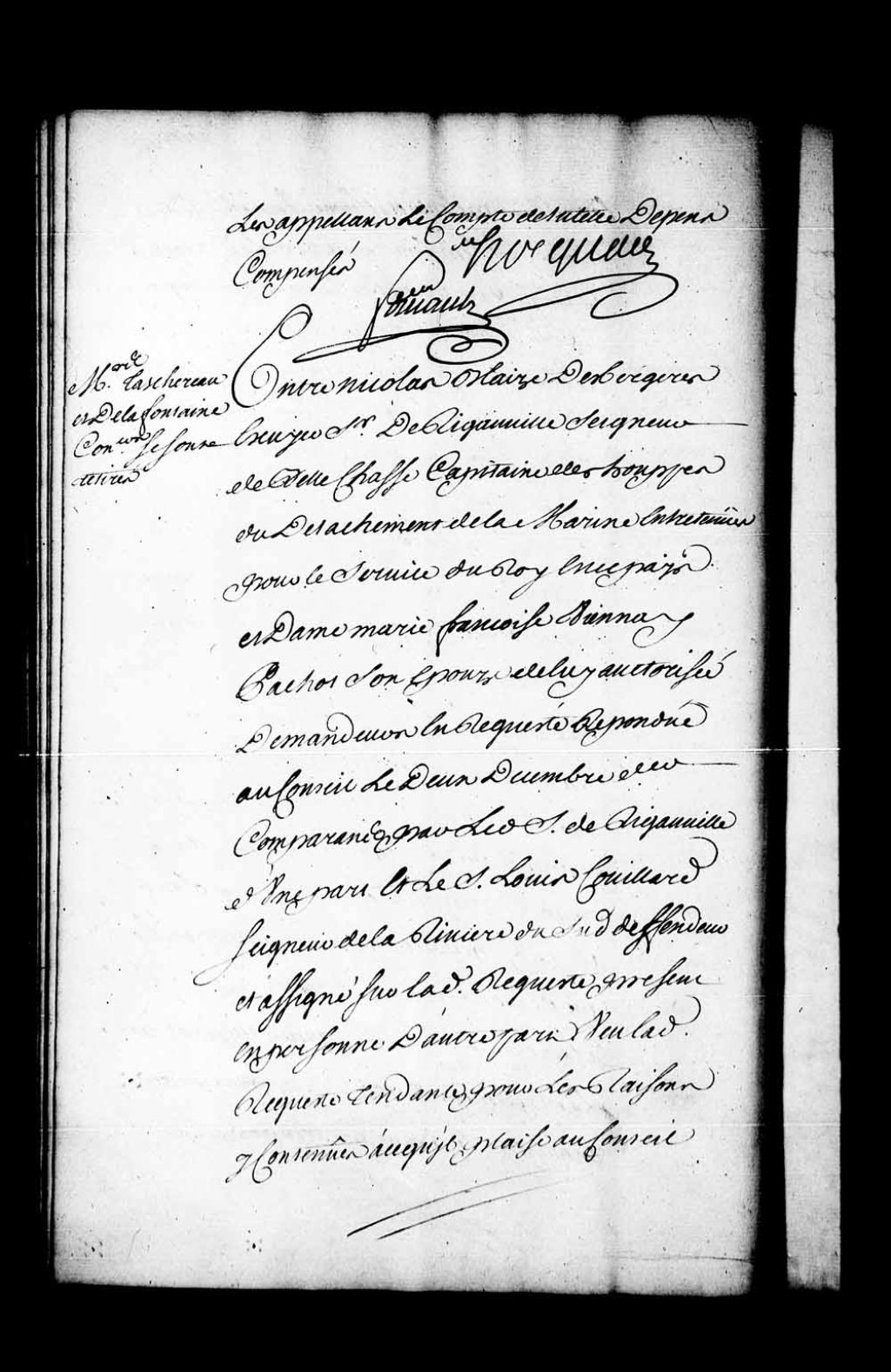 Arrêt qui donne acte aux parties de la reprise d'instance dans la cause du 2 décembre 1737 entre feu Jean-Baptiste Couillard de Lespinay, seigneur en partie de la Rivière-du-Sud, lieutenant général de l'Amirauté de Québec, contre Nicolas Blaise des Bergères de Rigauville, seigneur de Bellechasse, capitaine dans les troupes, et Marie Françoise Vienney Pachot, son épouse, 13 janvier 1738, Archives nationales à Québec, Fonds Conseil souverain, (03Q,TP1,S28,P18616).