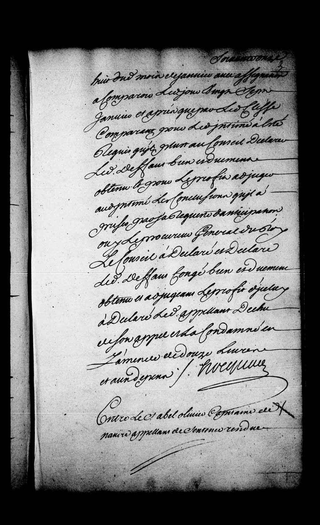 Arrêt qui appointe les parties en droit à écrire et produire, dans les délais de l'ordonnance, devant Eustache Chartier de Lotbinière, conseiller, dans la cause entre Abel Olivier, capitaine de navire et appelant de la sentence rendu en l'Amirauté de Québec, le 25 janvier 1738, contre le sieur Pierre Doumer fils, armateur de la ville de Bordeaux, 10 février 1738, Archives nationales à Québec, Fonds Conseil souverain, (03Q,TP1,S28,P18634).