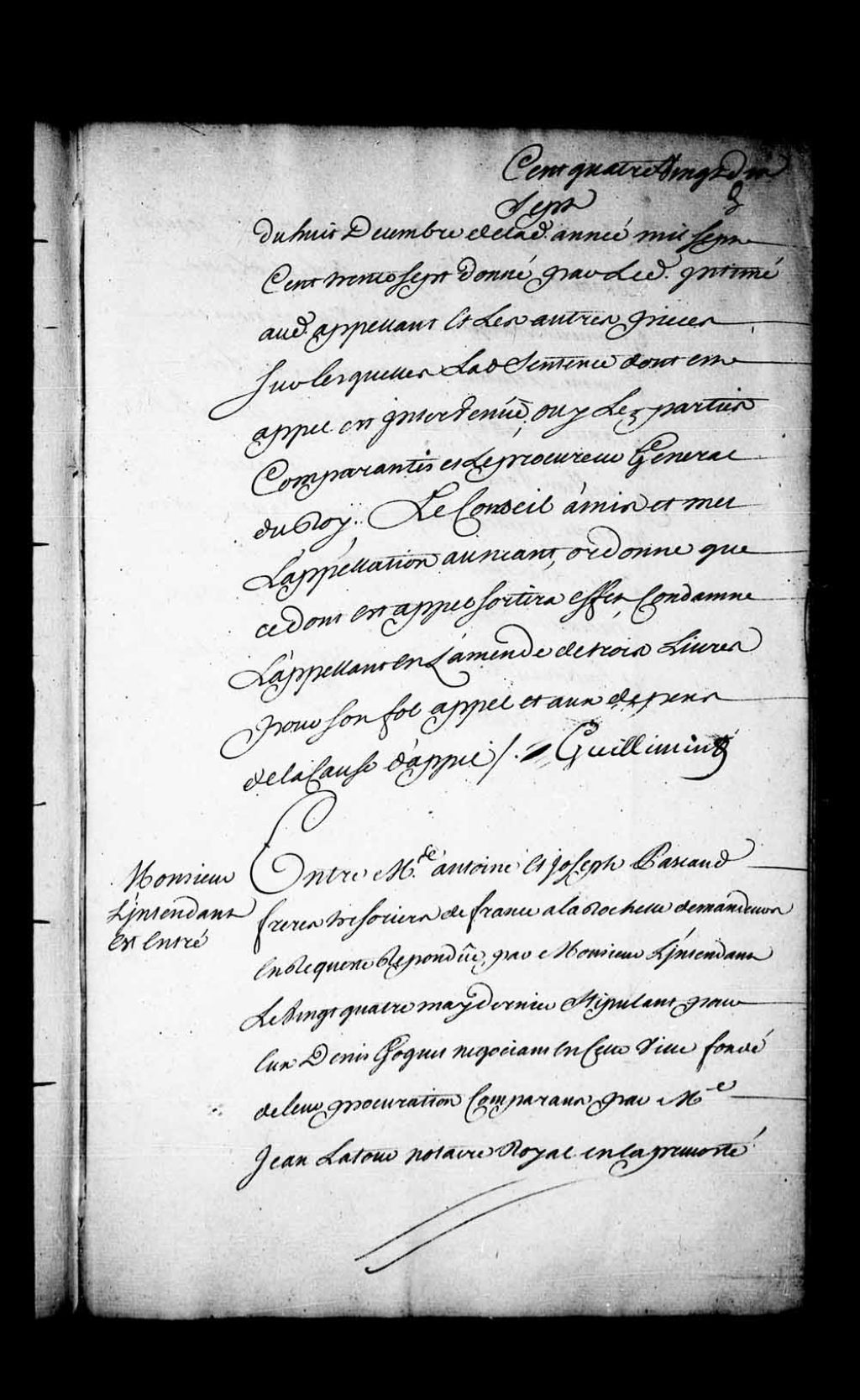 Arrêt qui continue l'audience à lundi prochain dans la cause entre Antoine et Joseph Pascaud, frères, trésoriers de France à La Rochelle, contre Louis Gugnière, bourgeois de Québec, au nom et comme exécuteur testamentaire de feu François Levasseur et curateur élu à la succession vacante, 2 juin 1738, Archives nationales à Québec, Fonds Conseil souverain, (03Q,TP1,S28,P18690).