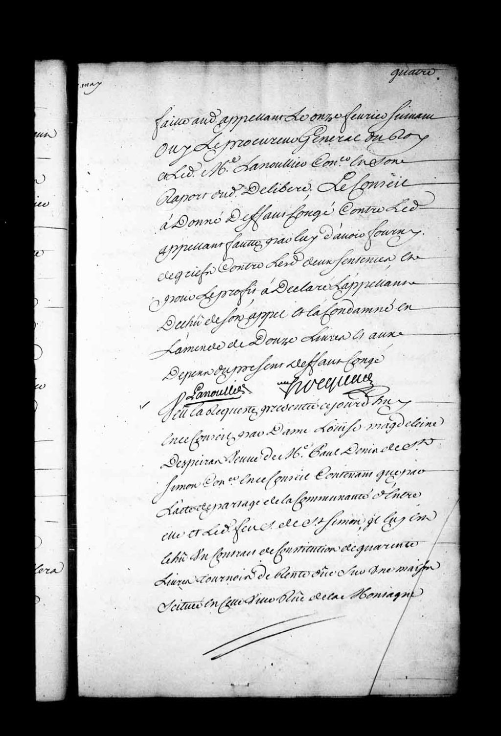 Arrêt qui ordonne que par le sieur Maillou, architecte, et le sieur Jouineau, charpentier, il sera fait visite et estimation des maison et emplacement dont il est question dans la cause entre Louise-Madeleine dePeiras, veuve de Paul Denys de Saint-Simon , conseiller, contre Jacques Bausang et Geneviève Allard, son épouse, 2 juin 1738, Archives nationales à Québec, Fonds Conseil souverain, (03Q,TP1,S28,P18692).