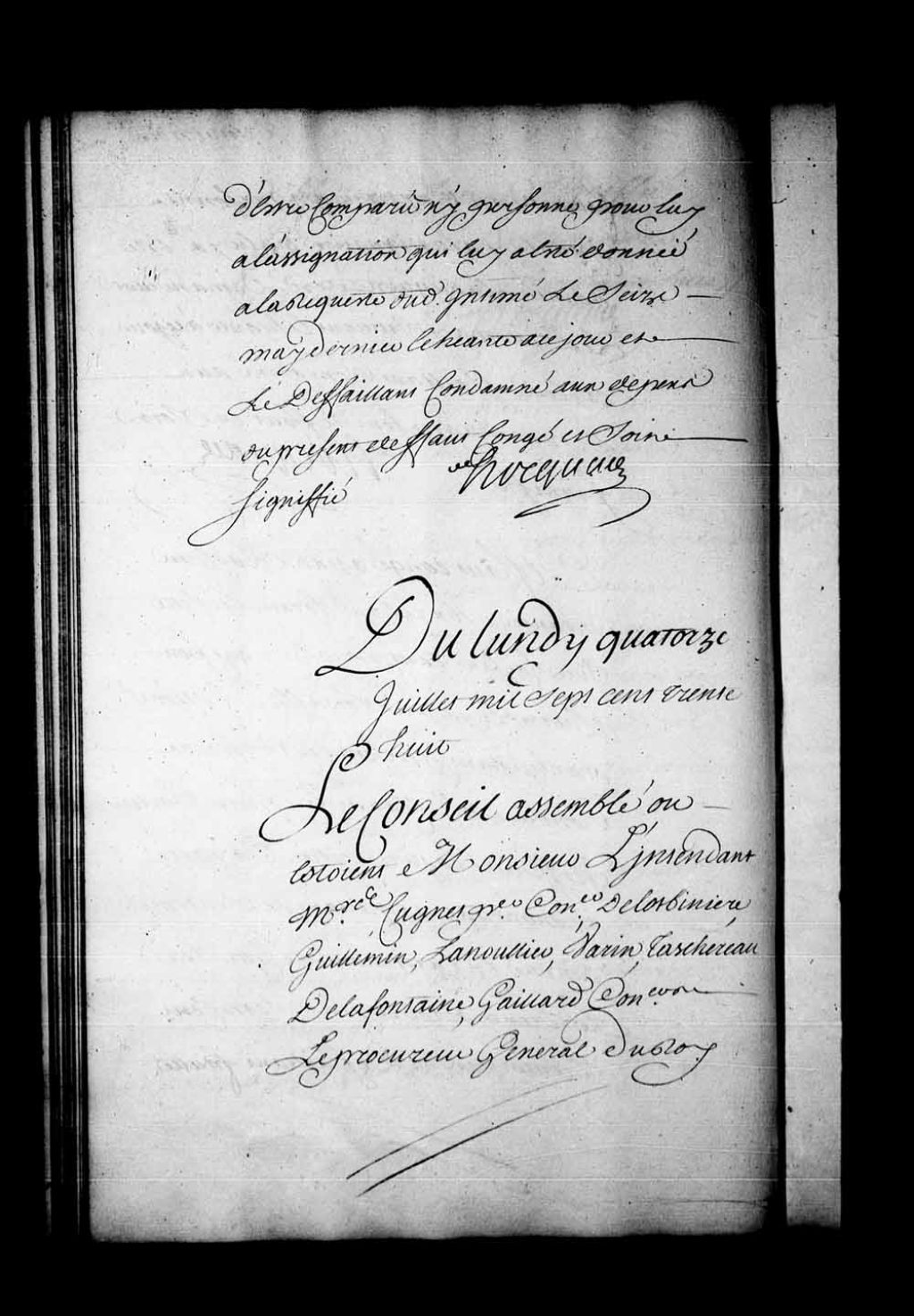 Arrêt qui, dans la cause entre Nicolas Boisseau, greffier de la Prévôté de Québec, au nom et comme époux de Marie-Anne Pagé Quercy, contre Marie-Anne Hubert, veuve d'Ignace Lecourt, et Marie-Renée Frérot, veuve de Joseph Pagé Quercy, explique en tant que besoin l'arrêt du 7 juillet 1738. Il est ordonné que la dite veuve Lecourt et la dite veuve Quercy ne seront tenues de contribuer à l'édification du mur de séparation que jusqu'à la hauteur de dix pieds à prendre du rez-de-chaussée et de deux pieds pour les fondements faisant en tout douze pieds, 14 juillet 1738, Archives nationales à Québec, Fonds Conseil souverain, (03Q,TP1,S28,P18707).