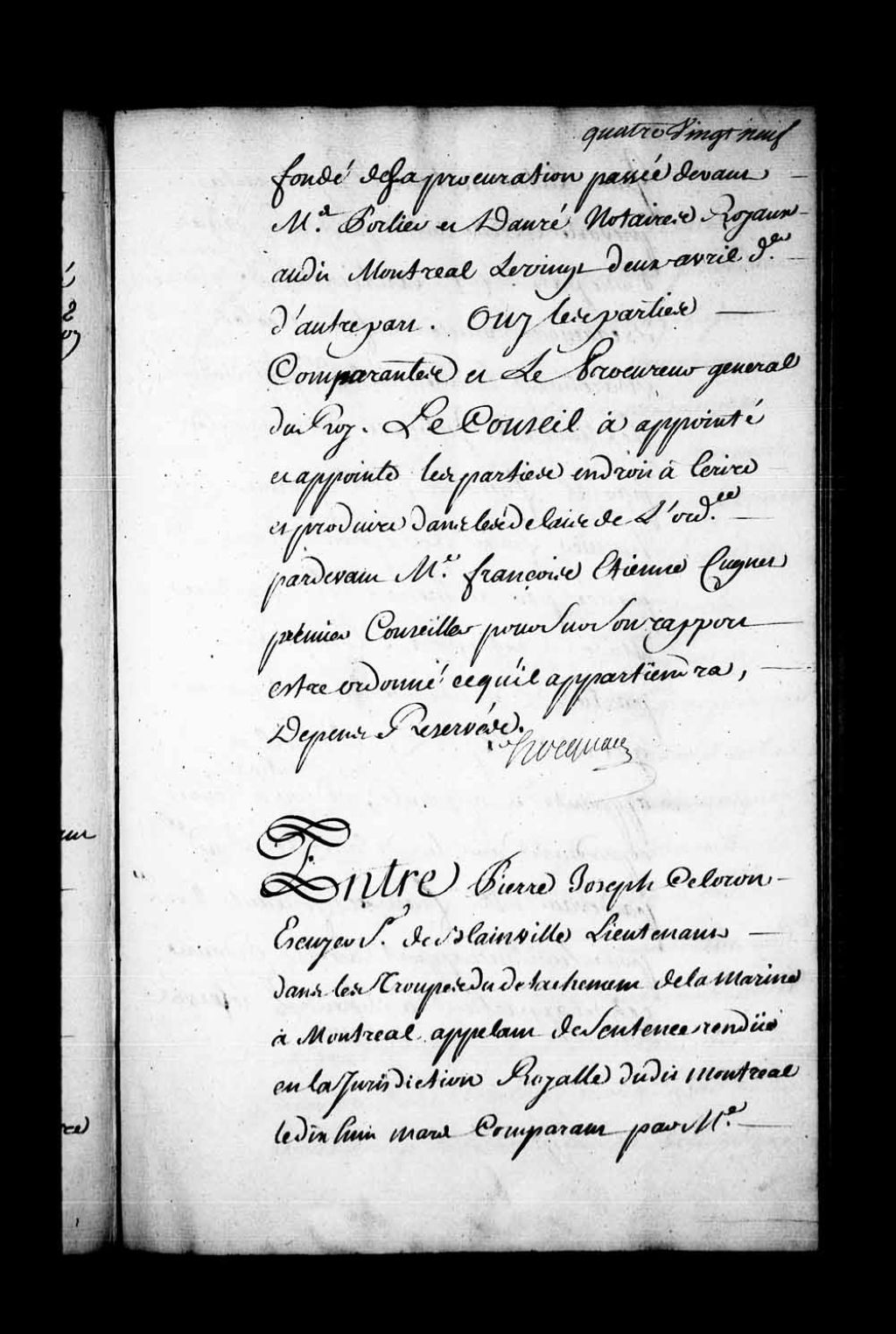 Arrêt qui appointe les parties en droit à écrire et produire, dans les délais de l'ordonnance, devant François Foucault, conseiller, dans la cause entre Pierre-Joseph Céloron de Blainville, lieutenant dans les troupes et appelant de la sentence rendue en la Juridiction de Montréal, le 18 mars 1838, contre Antoinette de Beaumont, veuve de Nicolas Marchand, huissier, 18 août 1738, Archives nationales à Québec, Fonds Conseil souverain, (03Q,TP1,S28,P18724).