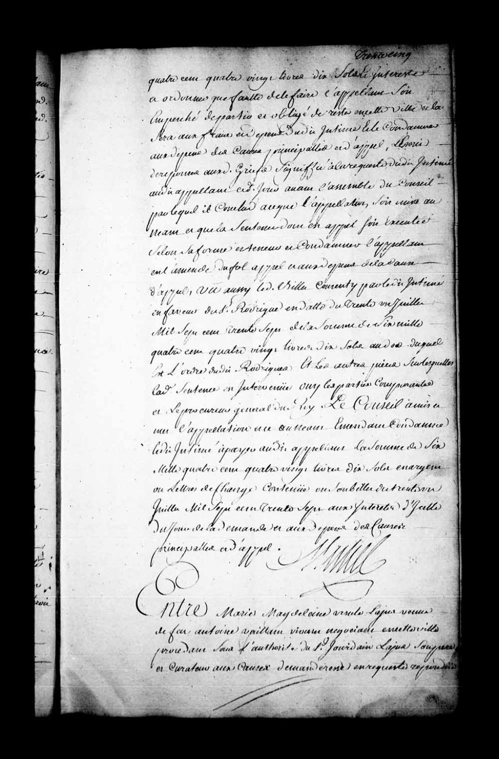 Arrêt qui, dans la cause entre Marie-Madeleine-Ursule Lajus, veuve de Antoine Vaillant, et les créanciers de la succession du dit Vaillant, accorde défaut contre Nicolas Gaspard Boucault, non comparant, et pour le profit ordonne que les arrêts, des 26 août et 9 septembre 1738, seront exécutés selon leur forme et teneur. En conséquence, les argenteries en question déposées d'office entre les mains du sieur Daine, greffier du Conseil, seront remis par lui à la dite demanderesse, 13 octobre 1738, Archives nationales à Québec, Fonds Conseil souverain, (03Q,TP1,S28,P18759).